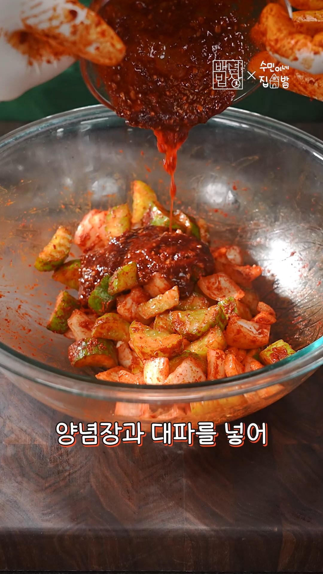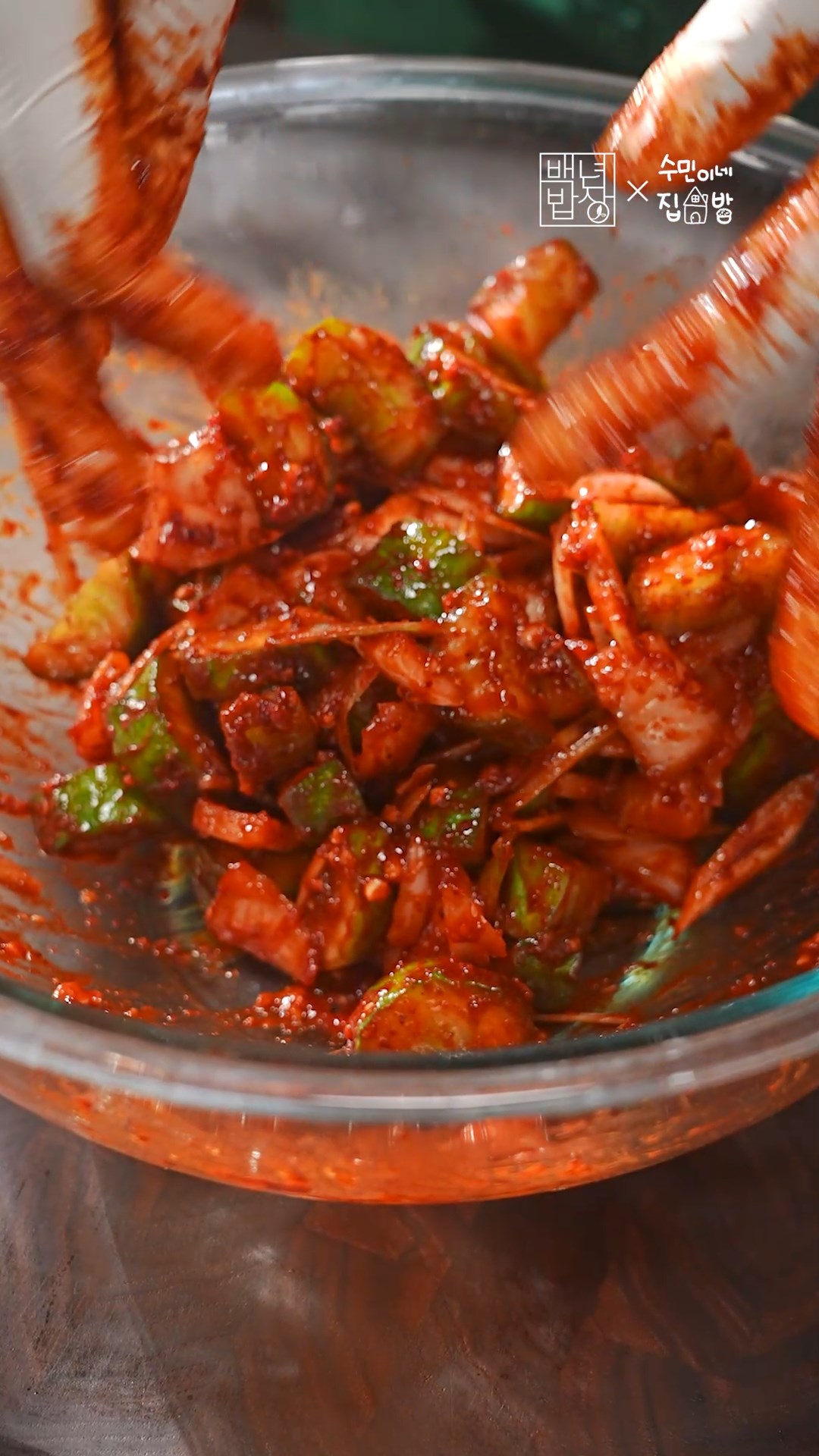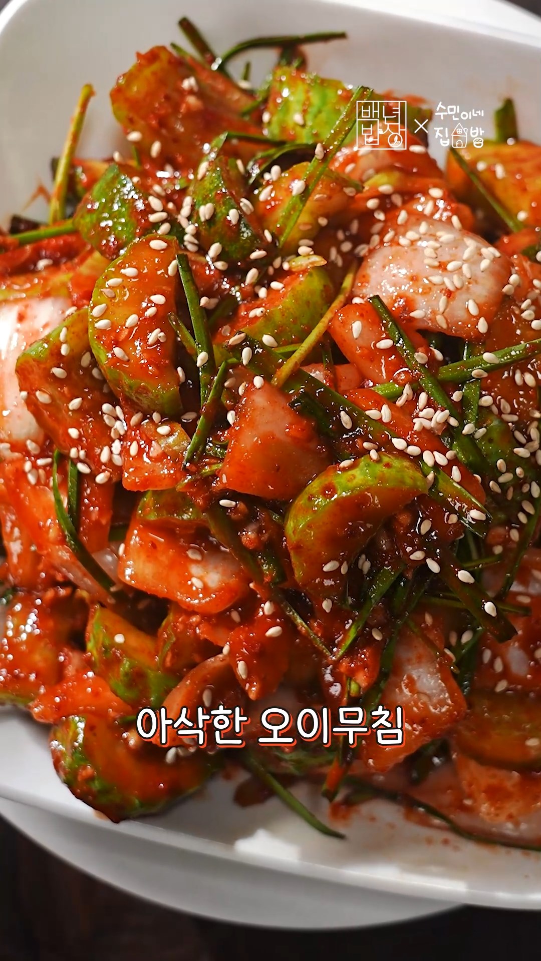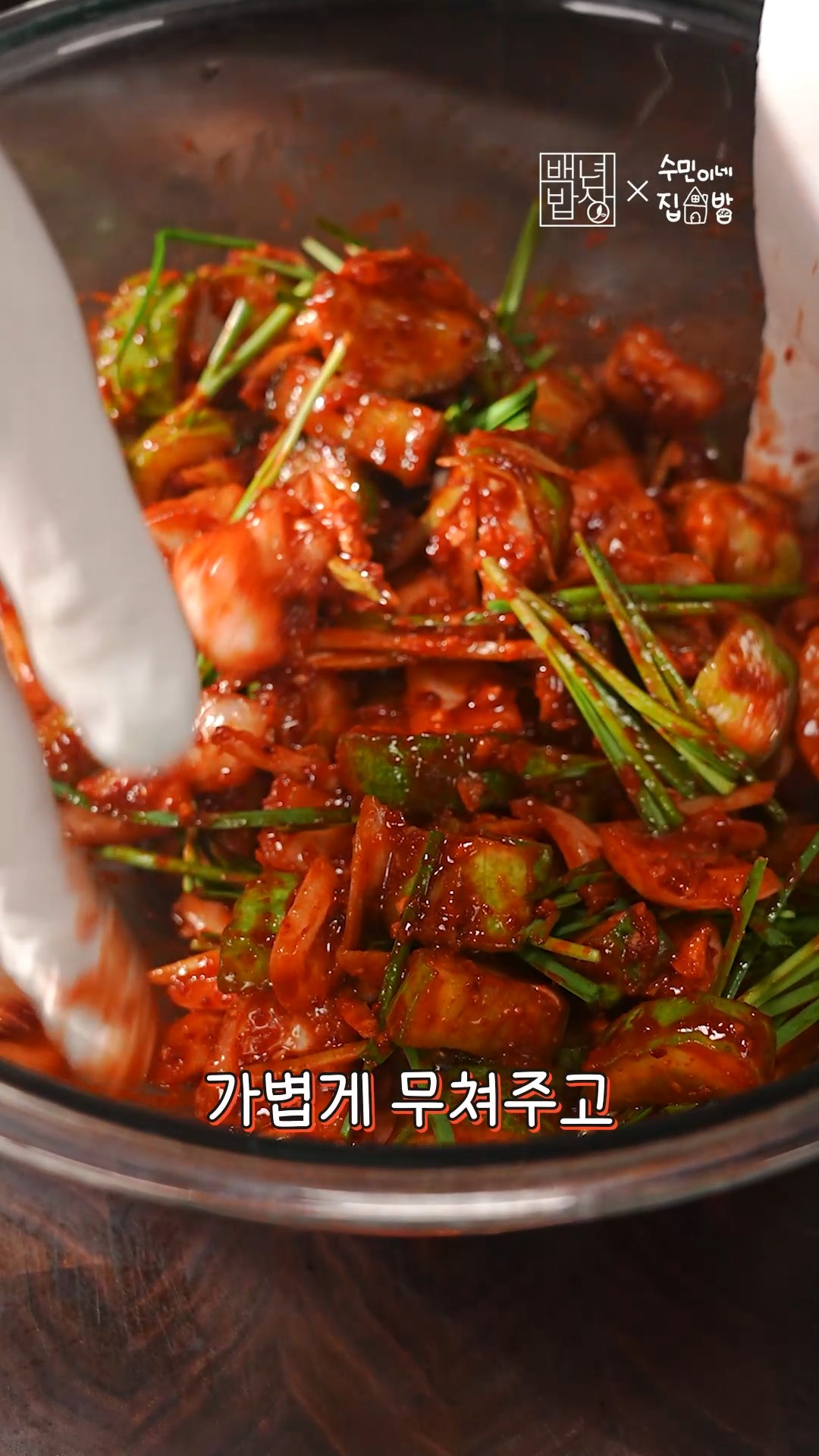 6. 오이가 무쳐지면 부추는 마지막에 넣어 무쳐주세요.