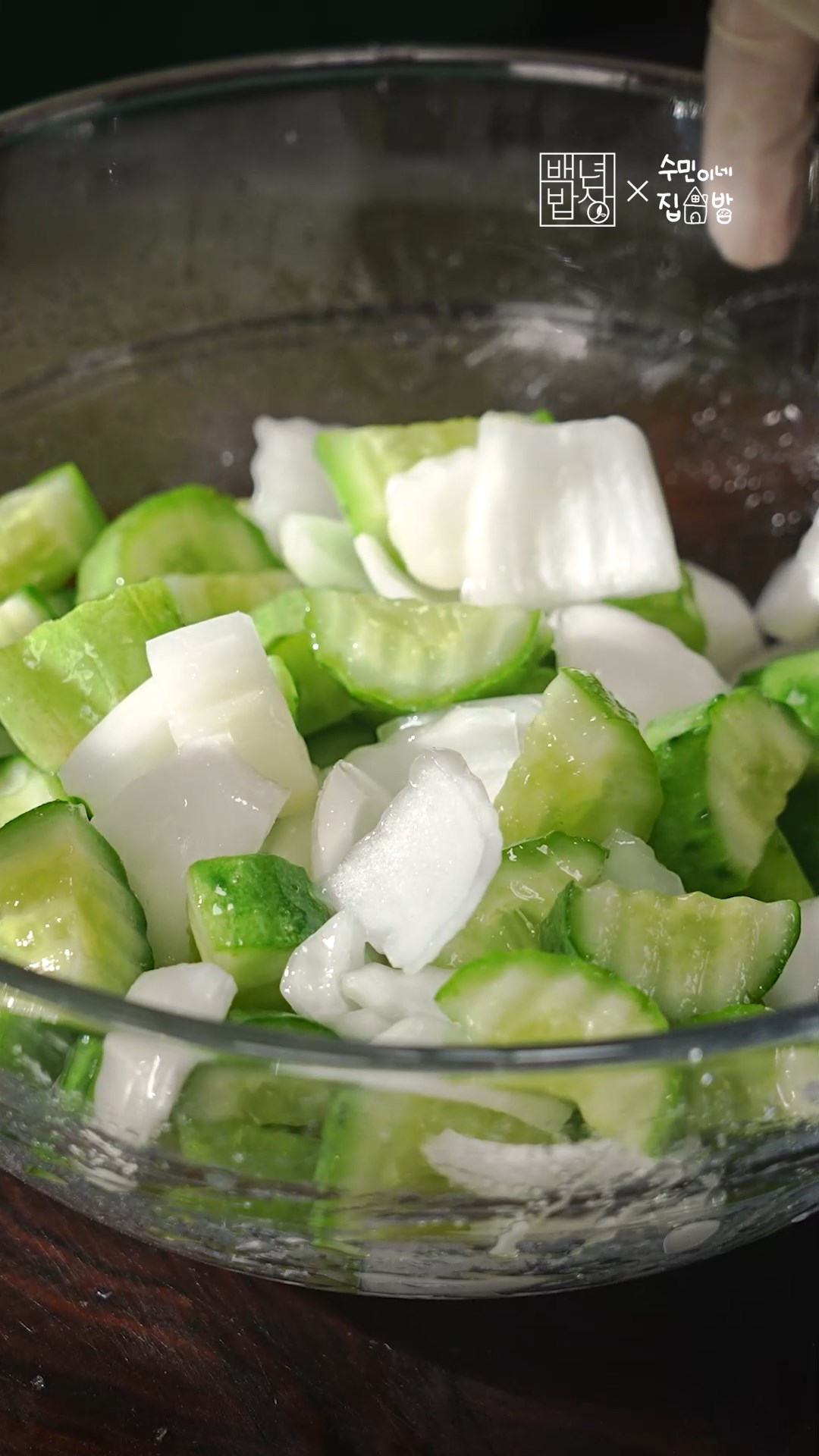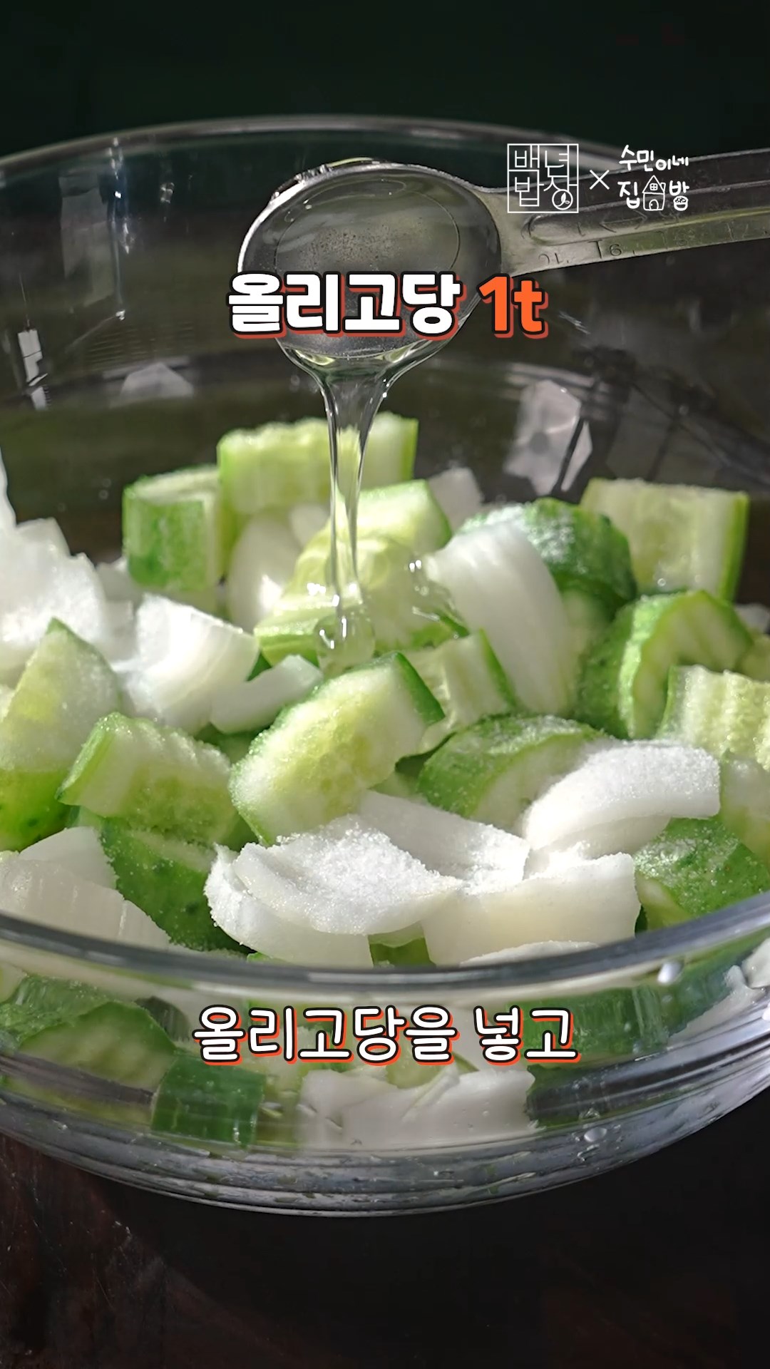 2. 식힌 오이는 도톰하게 썰어 소금과 올리고당에 넣어 20분간 절여주세요.