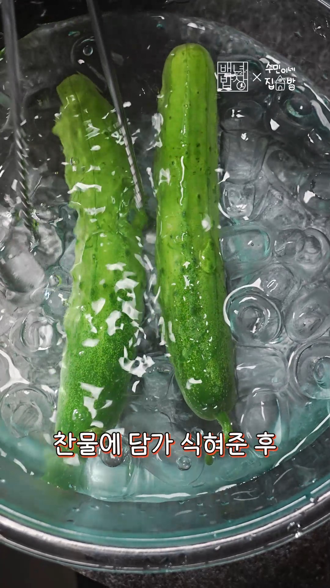 1. 깨끗하게 세척한 오이는 소금을 넣은 끓는물에 넣고 데쳐 찬물에 담가 식혀주세요.