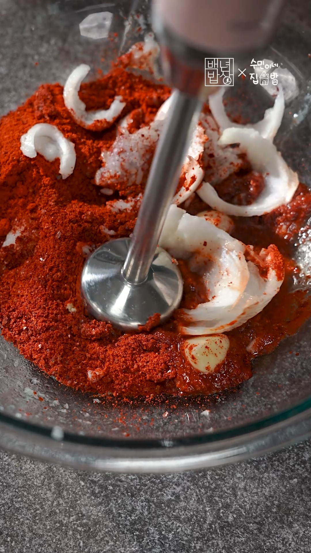 3. 믹서기에 양파, 생강, 마늘, 찬밥, 물, 매실청, 고춧가루, 새우젓을 넣고 갈아주세요.