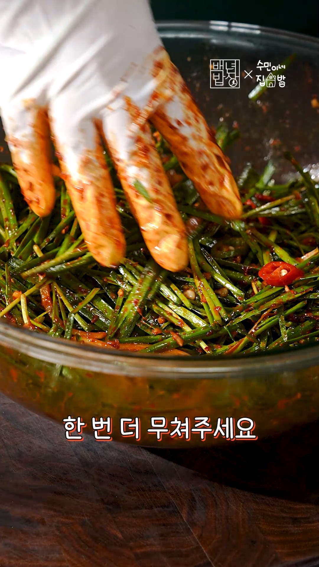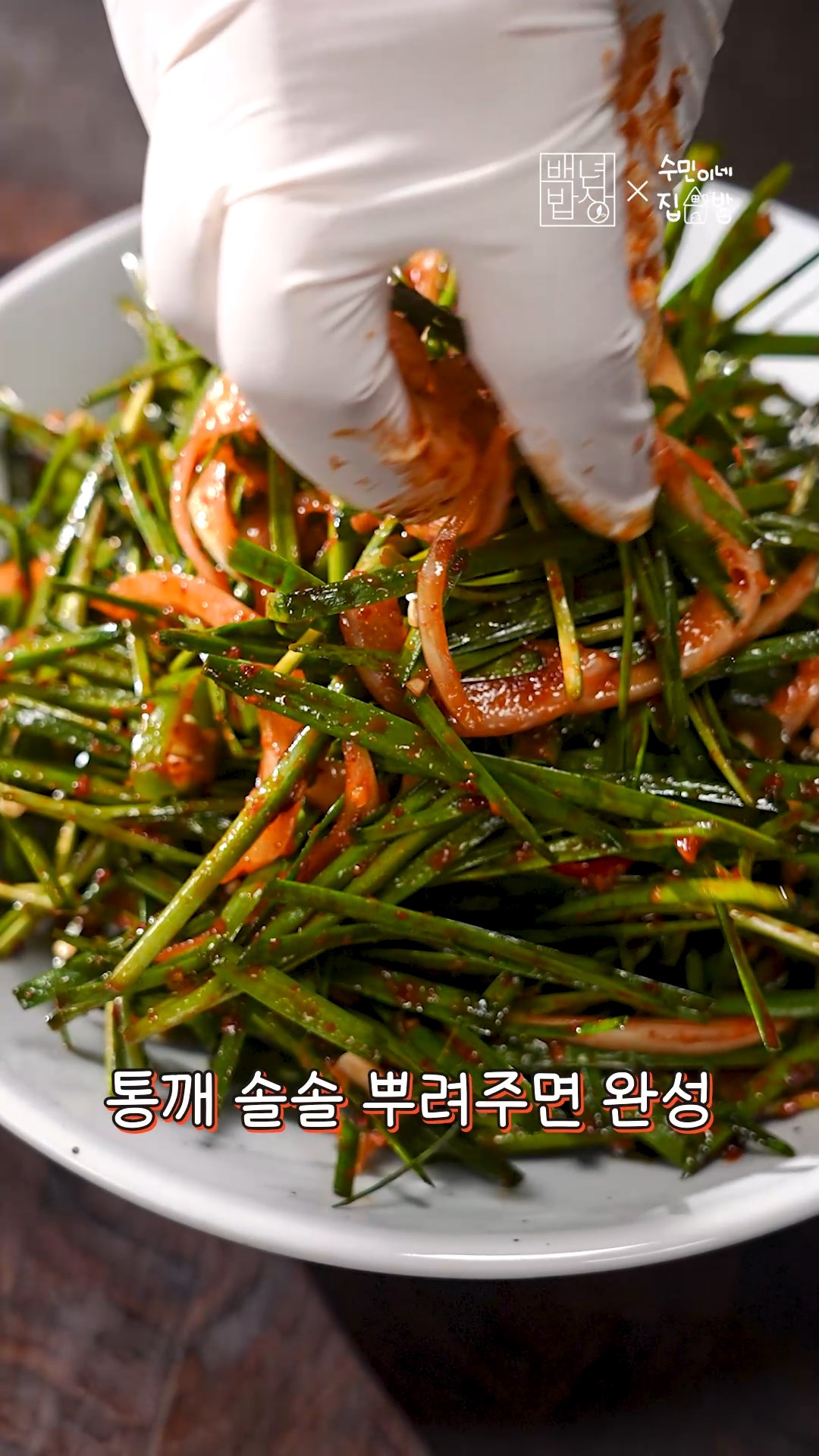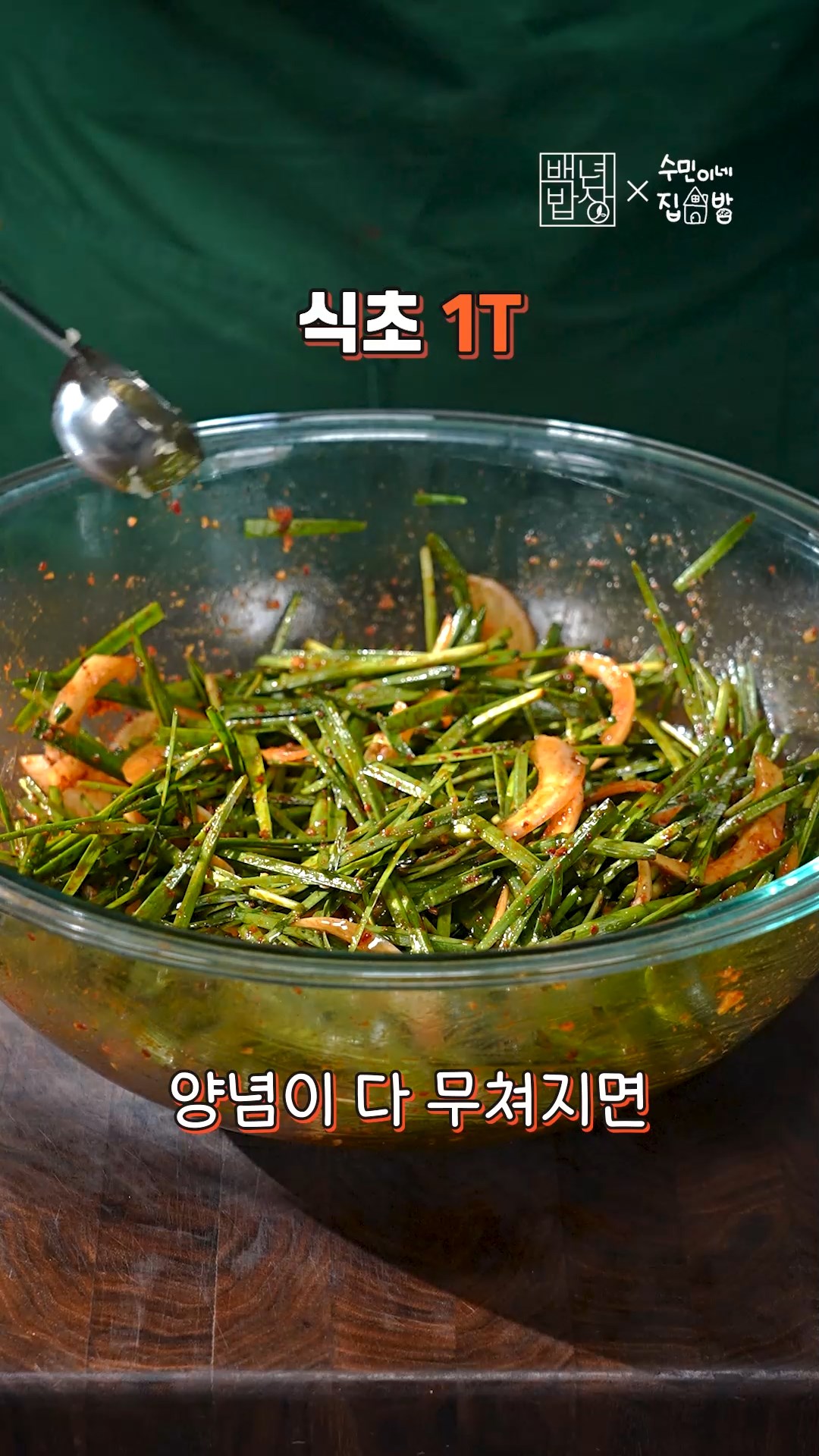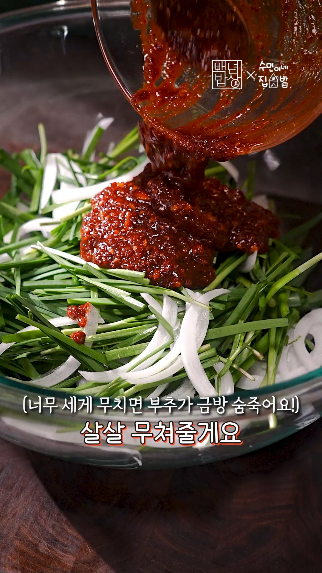 4. 양파, 부추에 소스 부어 살살 무쳐줄게요