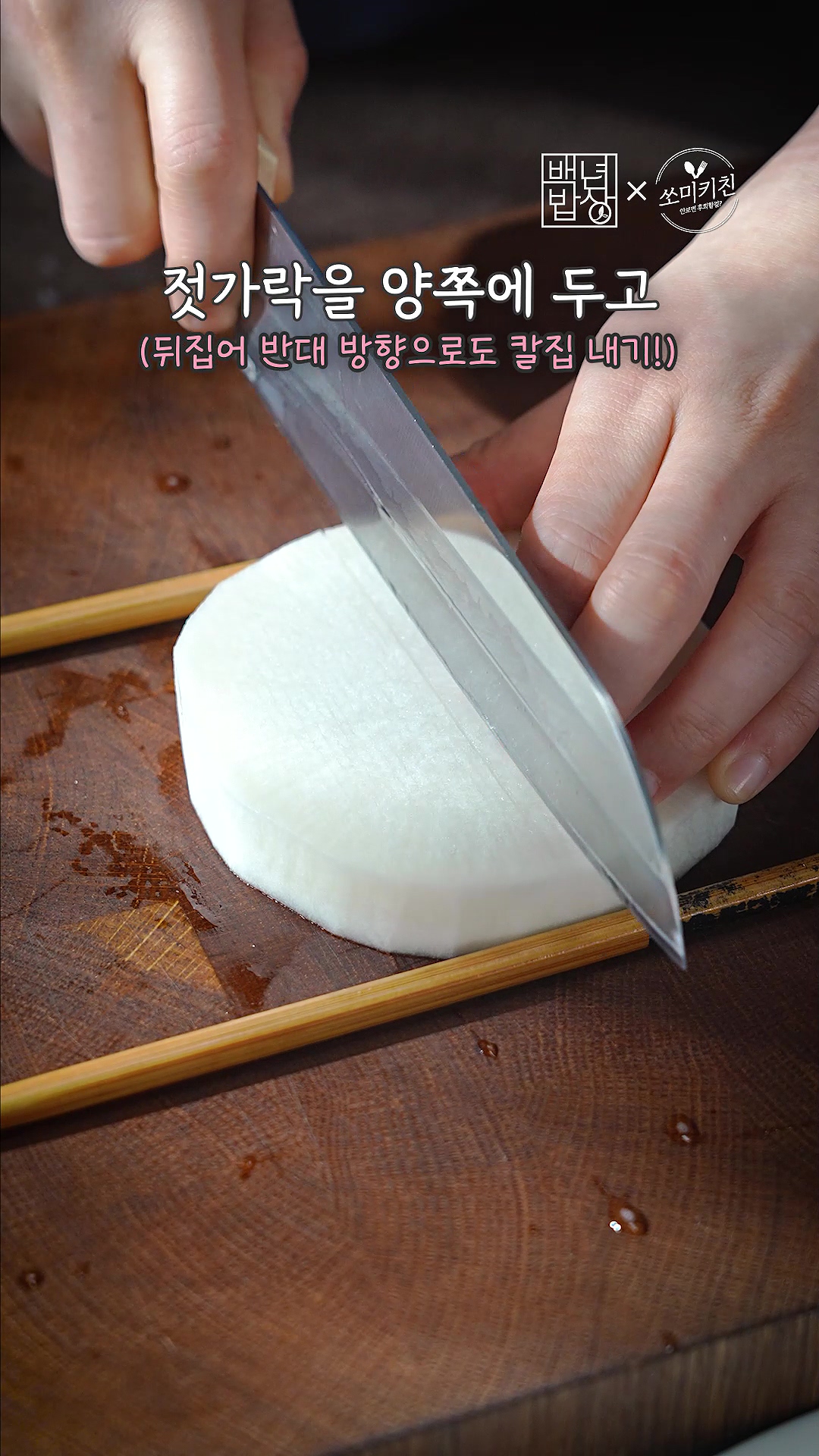 1. 무는 1.5cm로 잘라준 후, 젓가락을 양쪽에 두고 얇게 칼질해주세요.