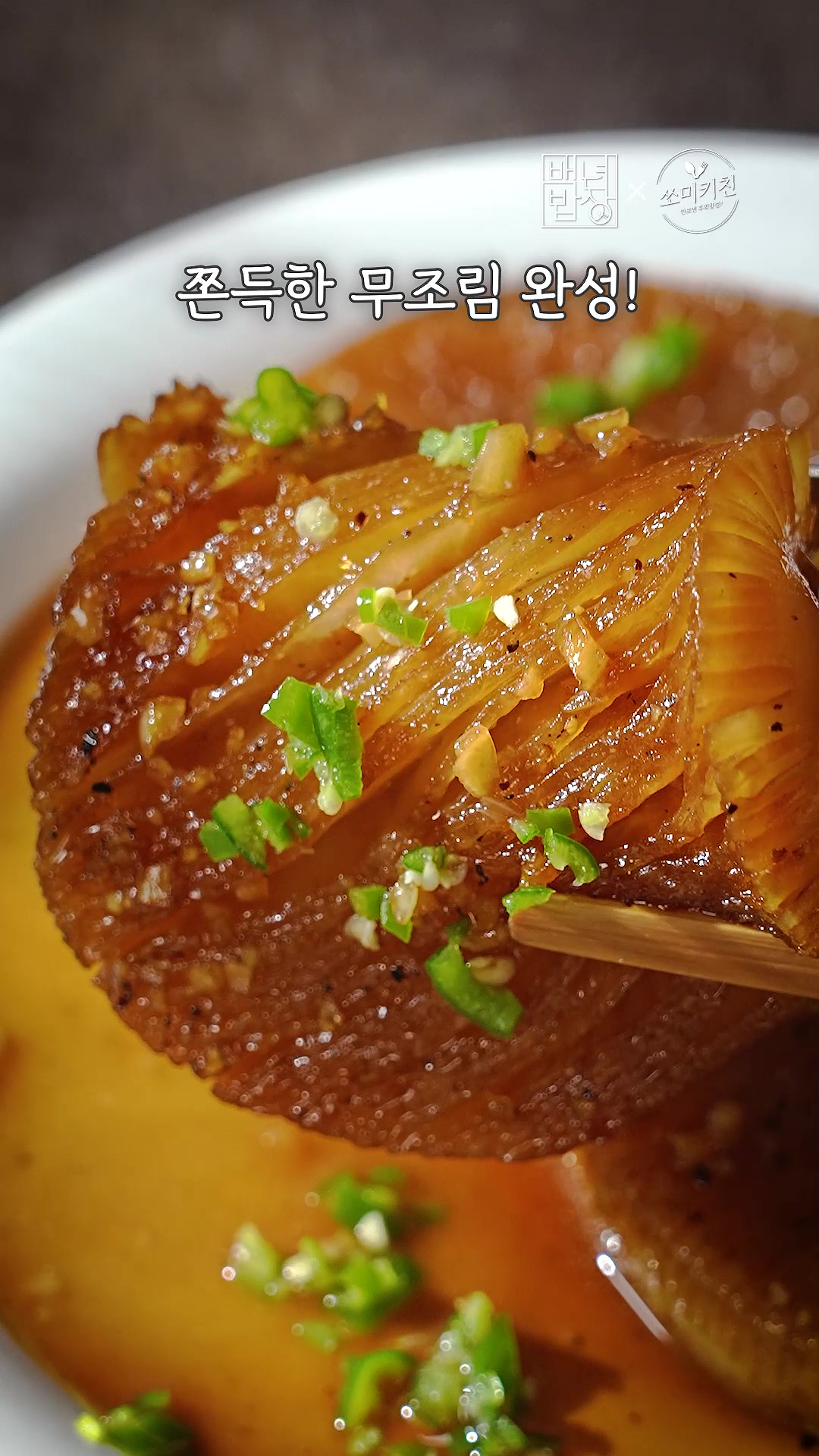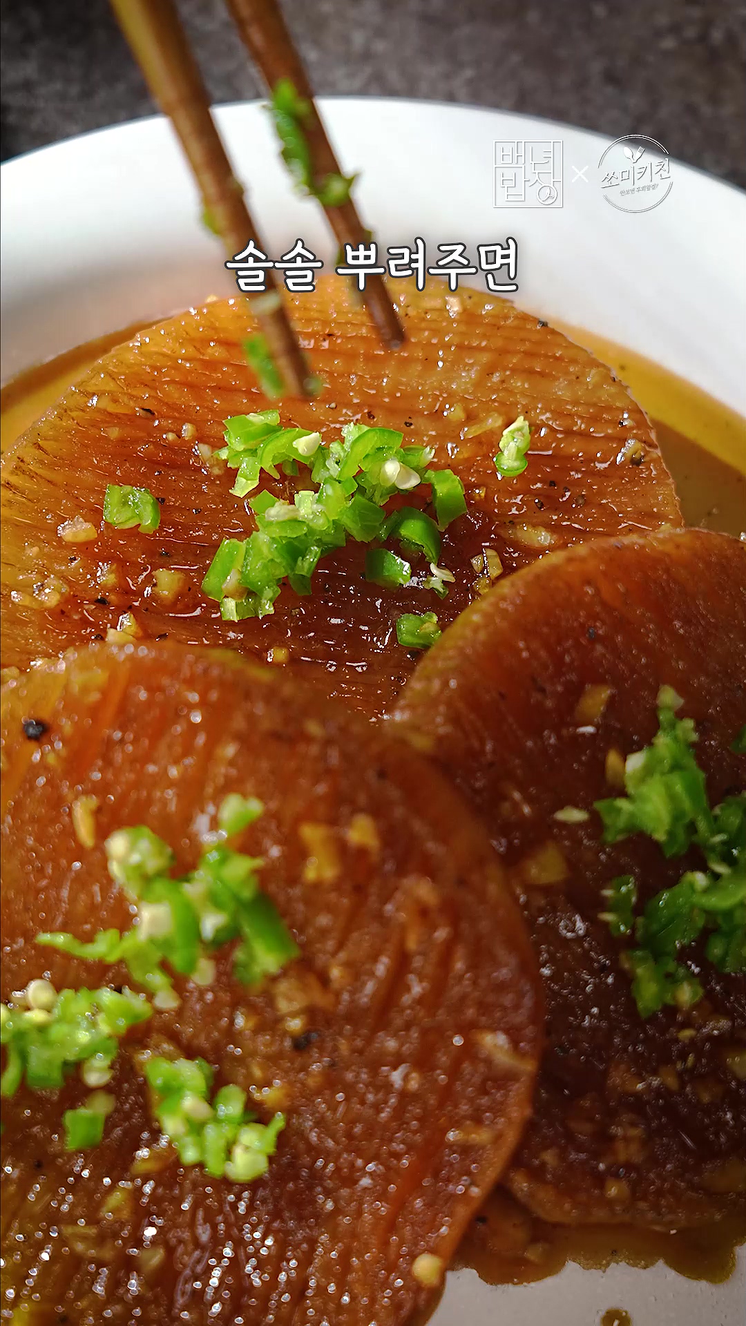 4. 접시에 담아 다진 청양고추까지 솔솔 뿌려주면 간이 쏙 배어 있는 쫀득한 무조림 완성!