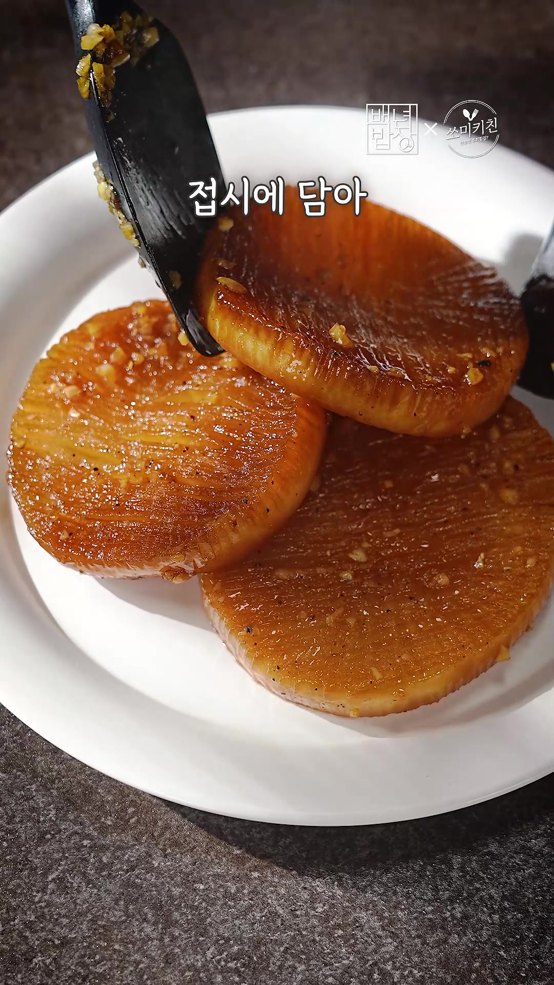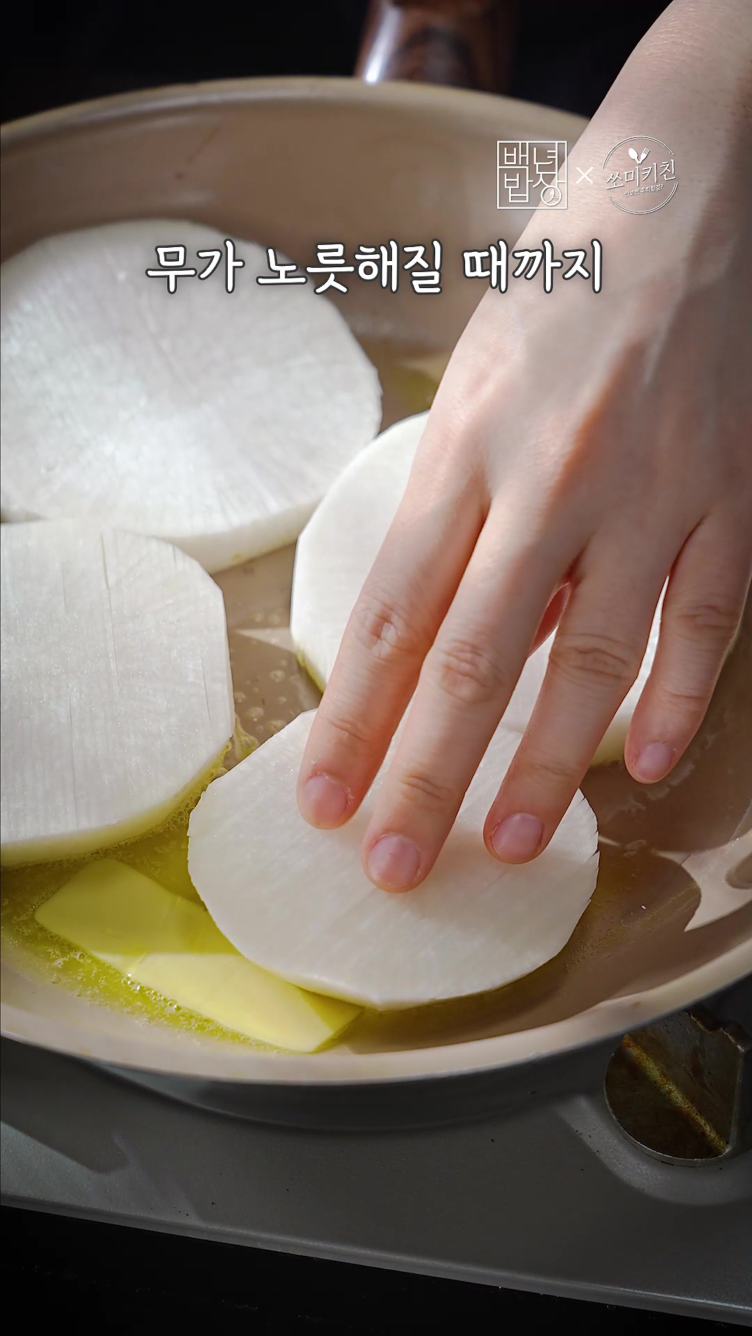 2. 팬에 식용유와 버터 넣고 무를 양면이 노릇해질 때까지 구워주세요.