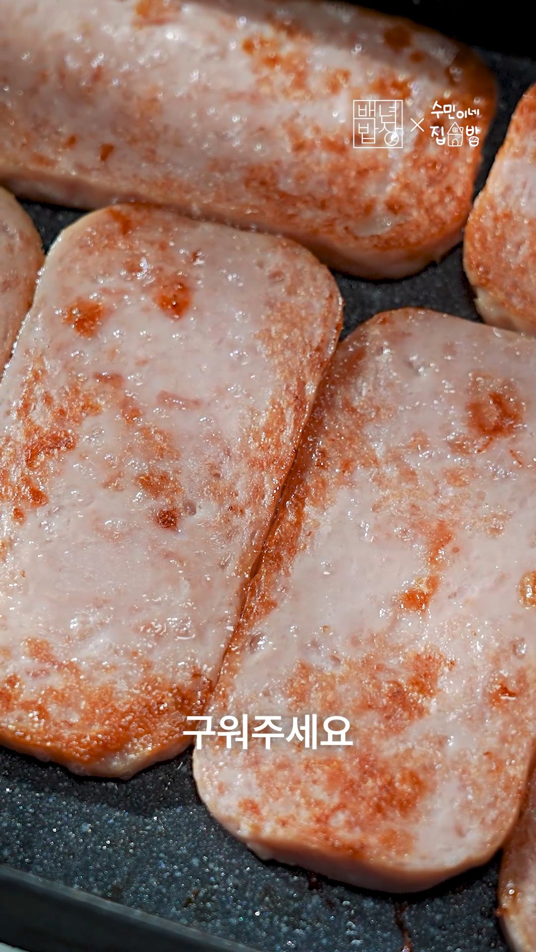 4. 스팸을 6등분으로 잘라 노릇하게 굽고 김은 반으로 잘라주세요.
