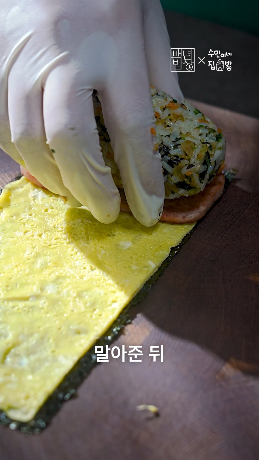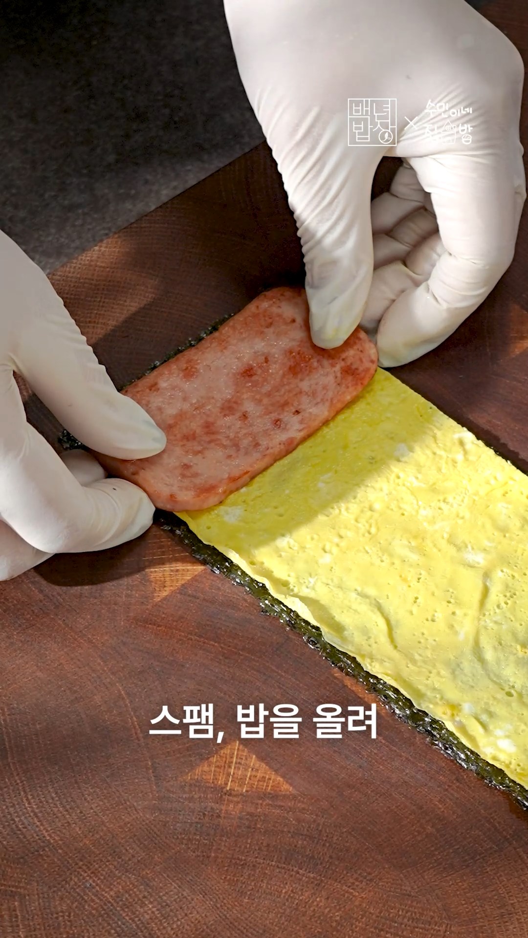 5. 김 위에 지단을 얹고 스팸을 올린 뒤 밥을 뭉쳐 올려 말아주고 땡땡하게 부풀때 까지 기다려주세요.