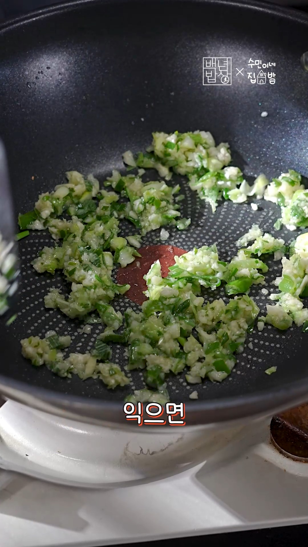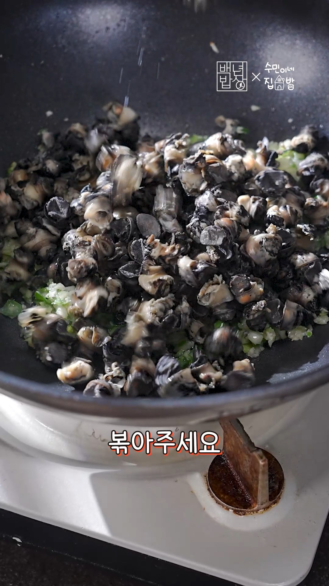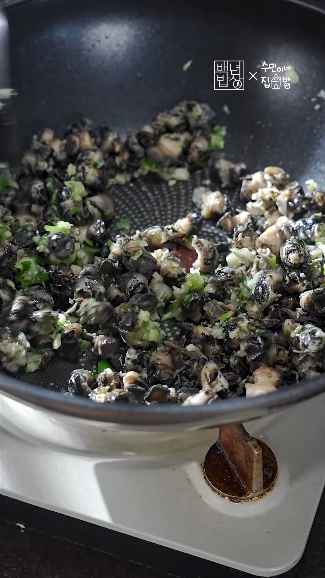 3. 팬에 기름을 두르고 다진마늘,대파를 넣고 볶은 뒤 우렁이를 넣고 볶아주세요.