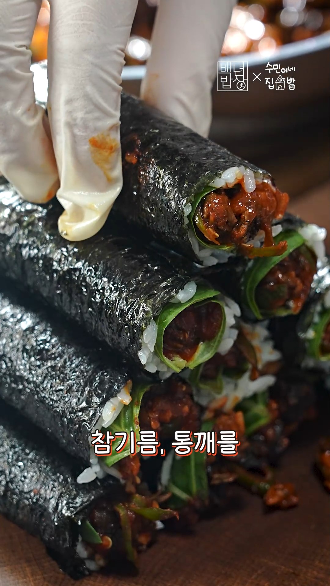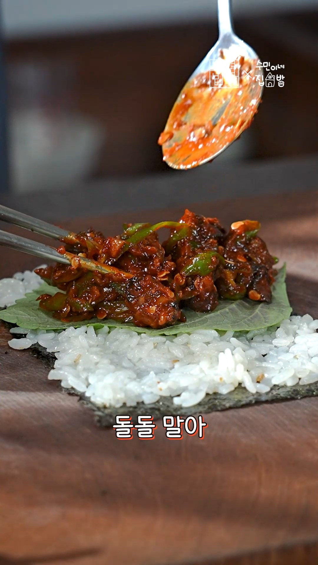 6. 밥 위에 깻잎을 깔고 우렁땡초장을 올려 말아주면 완성!
