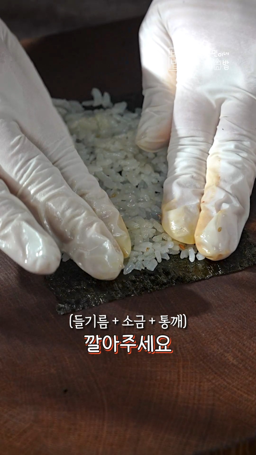 5. 길이가 긴 김에 짧은 김을 얹고 밥을 깔아주세요.