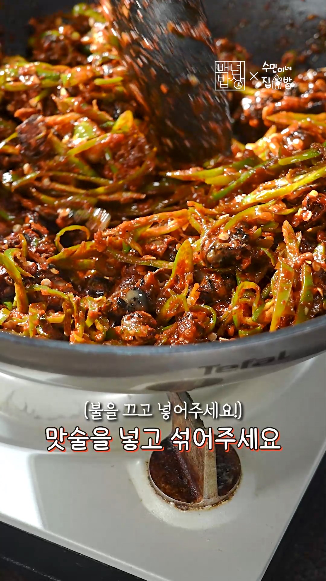 4. 고춧가루, 간장을 넣고 볶아주다 청양고추를 넣고 한번 더 볶은 뒤 불을 끄고 올리고당,참기름,통깨를 넣어주세요.