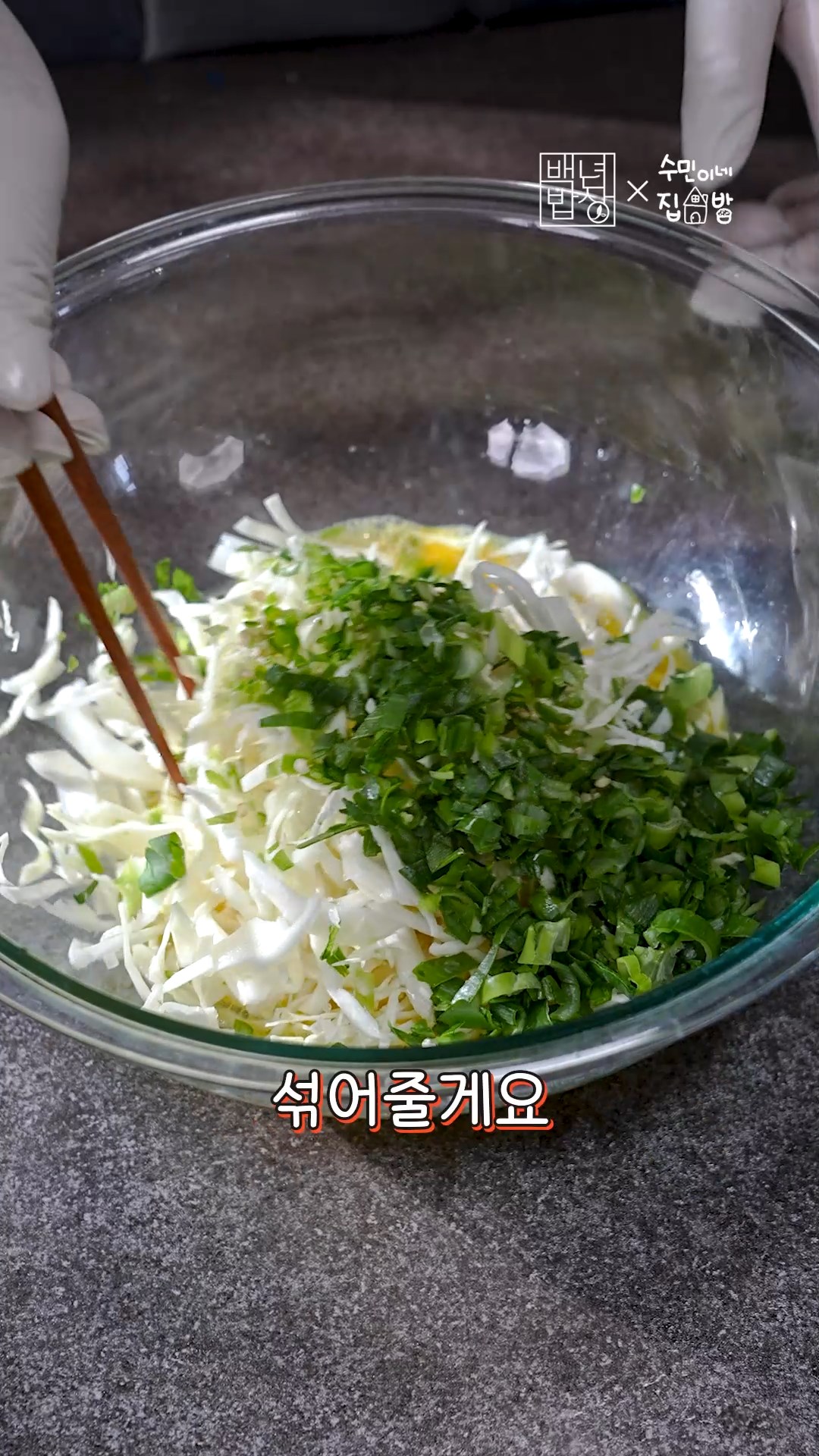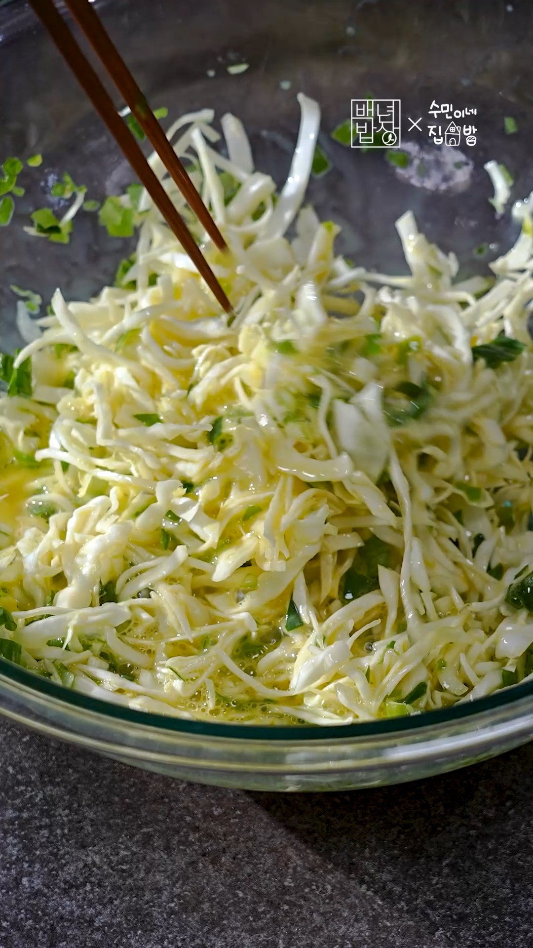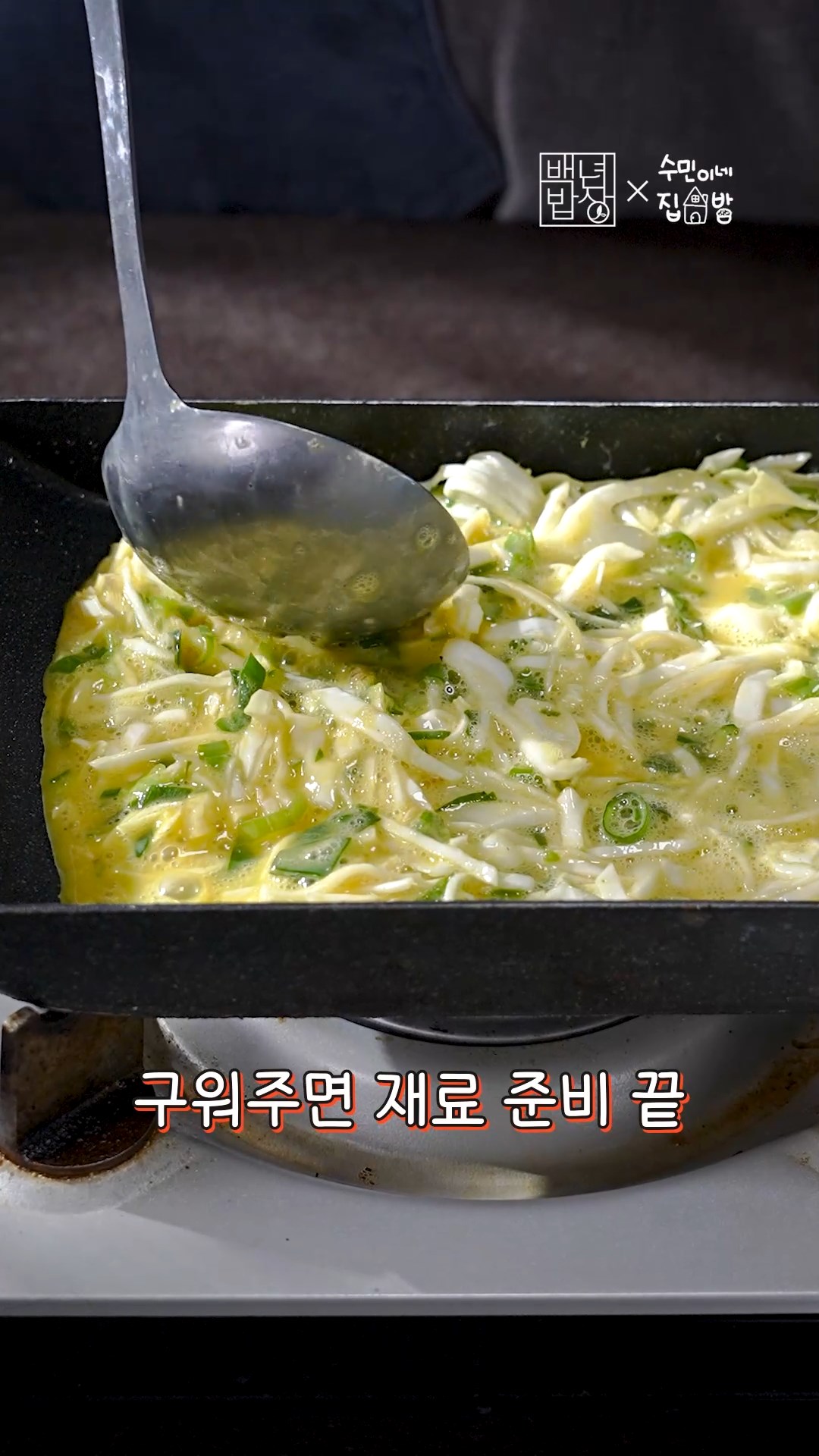 4. 계란을 풀어준 뒤에 양배추, 대파, 청양고추를 넣고 섞어주세요