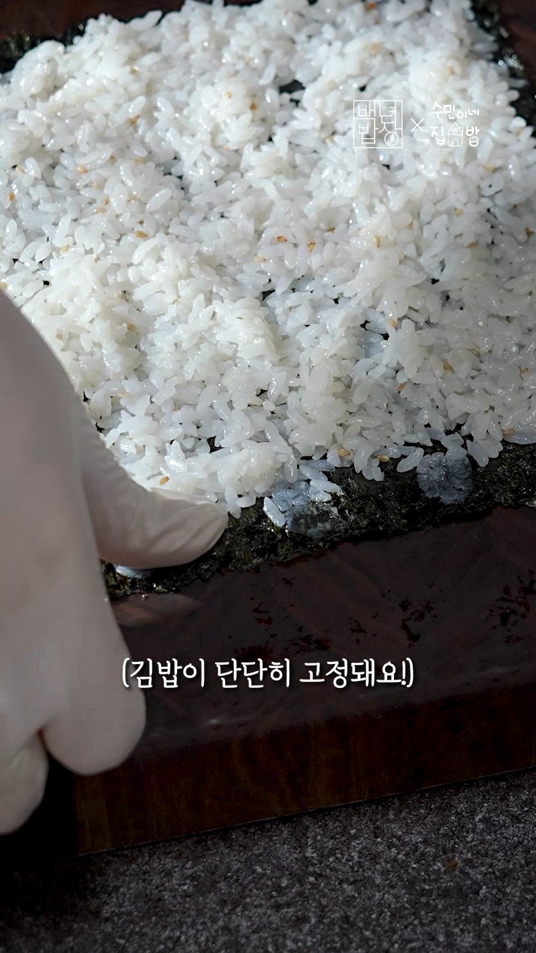 6. 김에 밥을 깔고 끝부분에 밥알을 눌러 뭉그러트려주세요