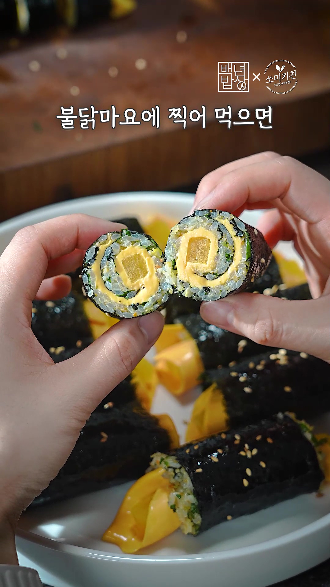 4. 김에 밥을 깔고 가위로 3등분 잘라준 뒤, 치즈와 단무지 올려 말아주면 완성!