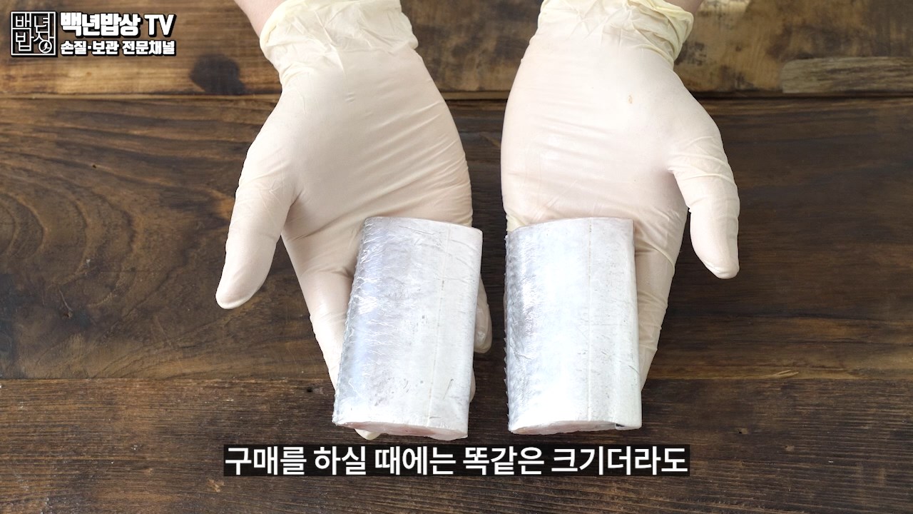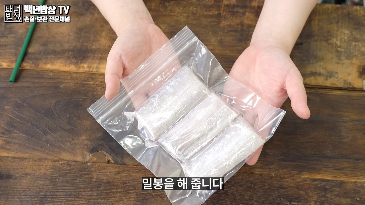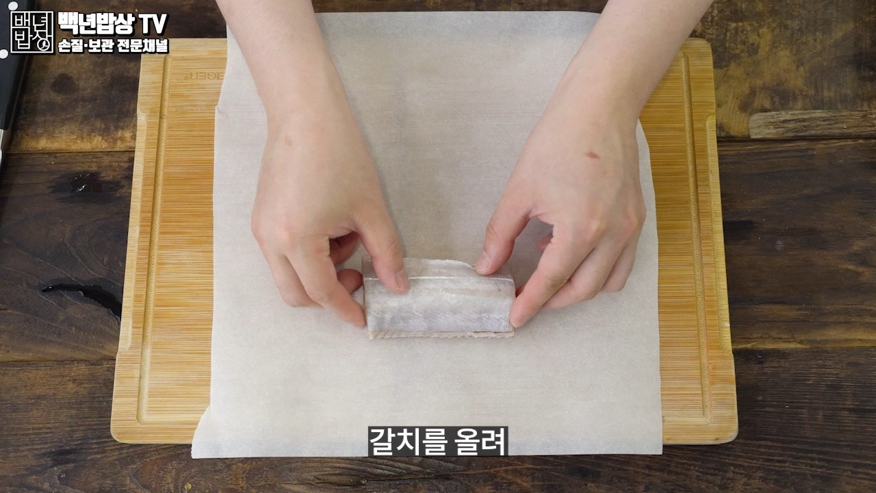 갈치가 겹치지 않게 친환경 랩에 하나씩 놓아 말아 준 후, 한 번에 먹을 만큼 소분하여 지퍼백에 넣어주세요.