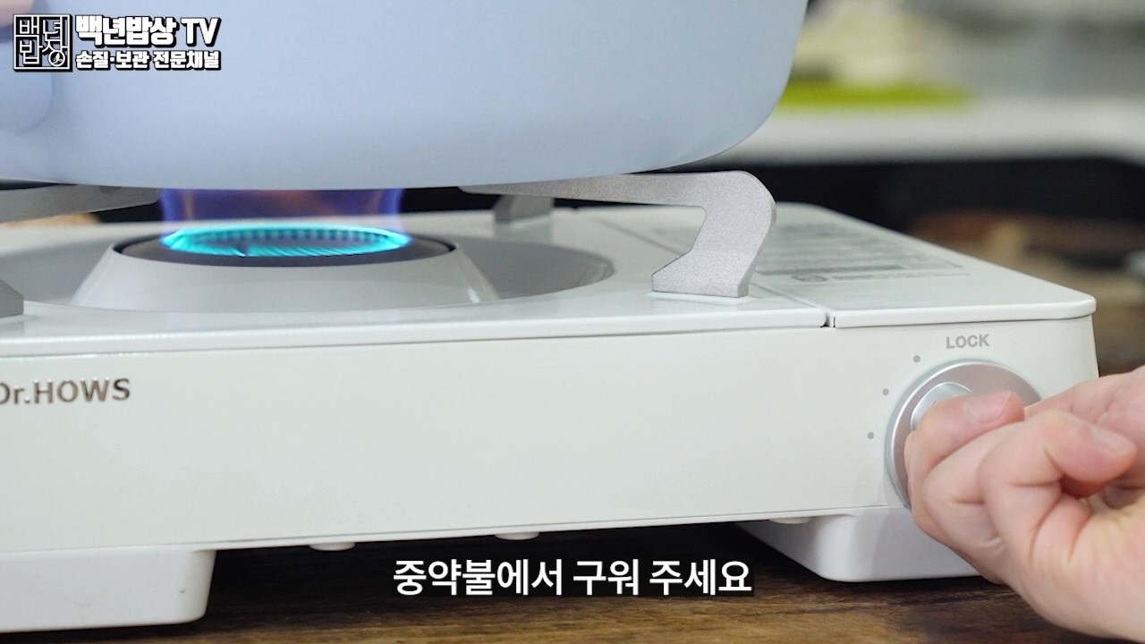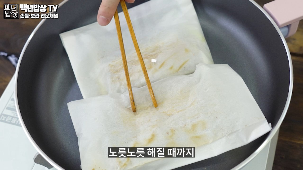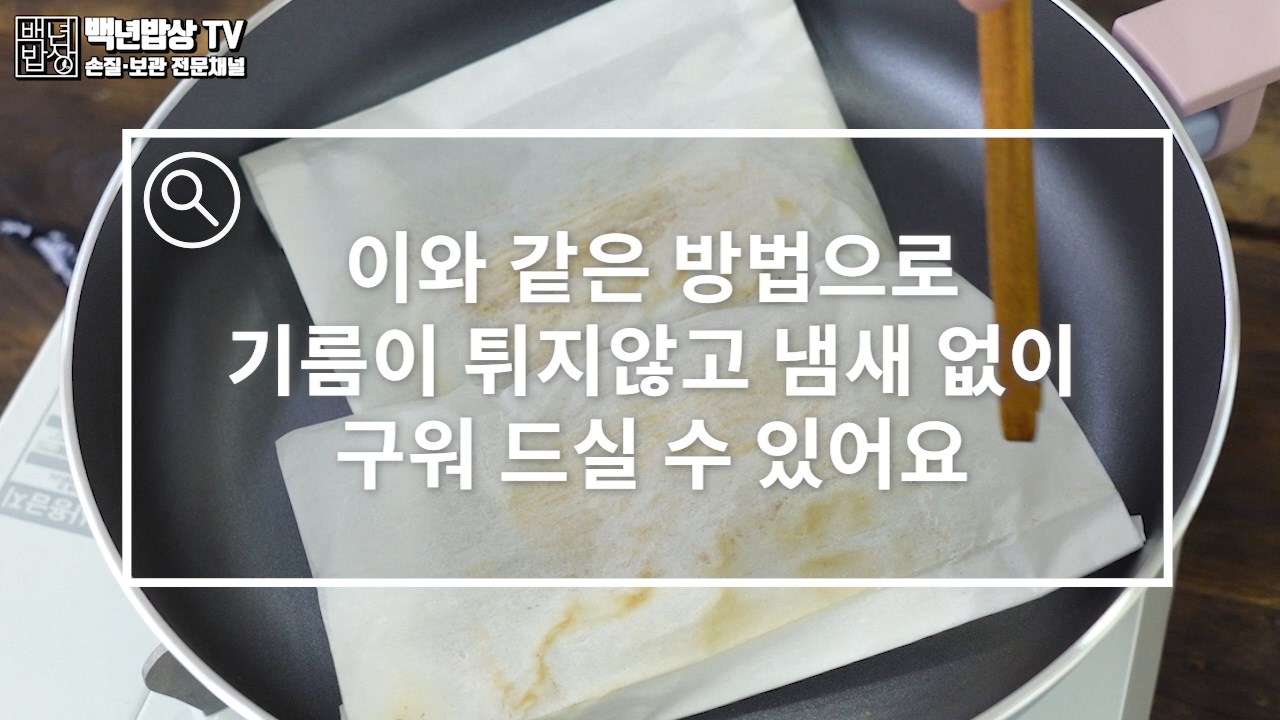 겉면이 어느 정도 익으면 뒤집어서 반대편도 익혀 줍니다. 노릇노릇 해질 때까지 같은 방법으로 익혀주세요. (이와 같은 갈치 굽는법으로 기름이 튀지 않고 냄새 없이 구워 드실 수 있어요)