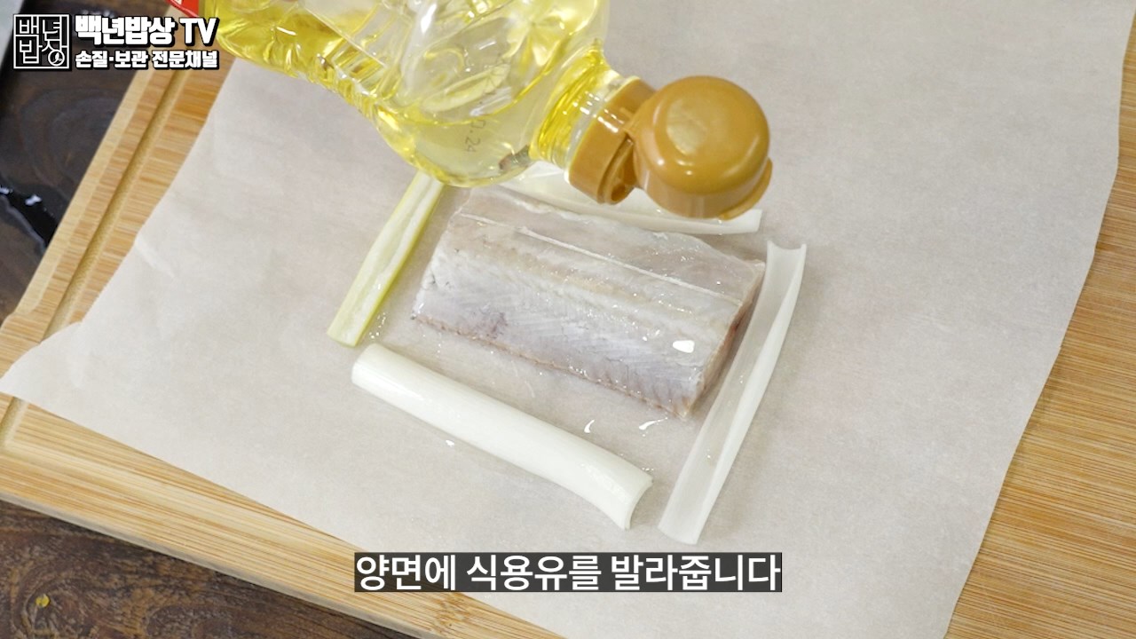 갈치 굽는법 꿀팁! 종이호일을 펼치고 갈치를 올려 대파 한 조각을 반 잘라 넣고, 양면에 식용유를 발라 줍니다. (대파를 넣으면 갈치의 비린 향을 잡아줘요)