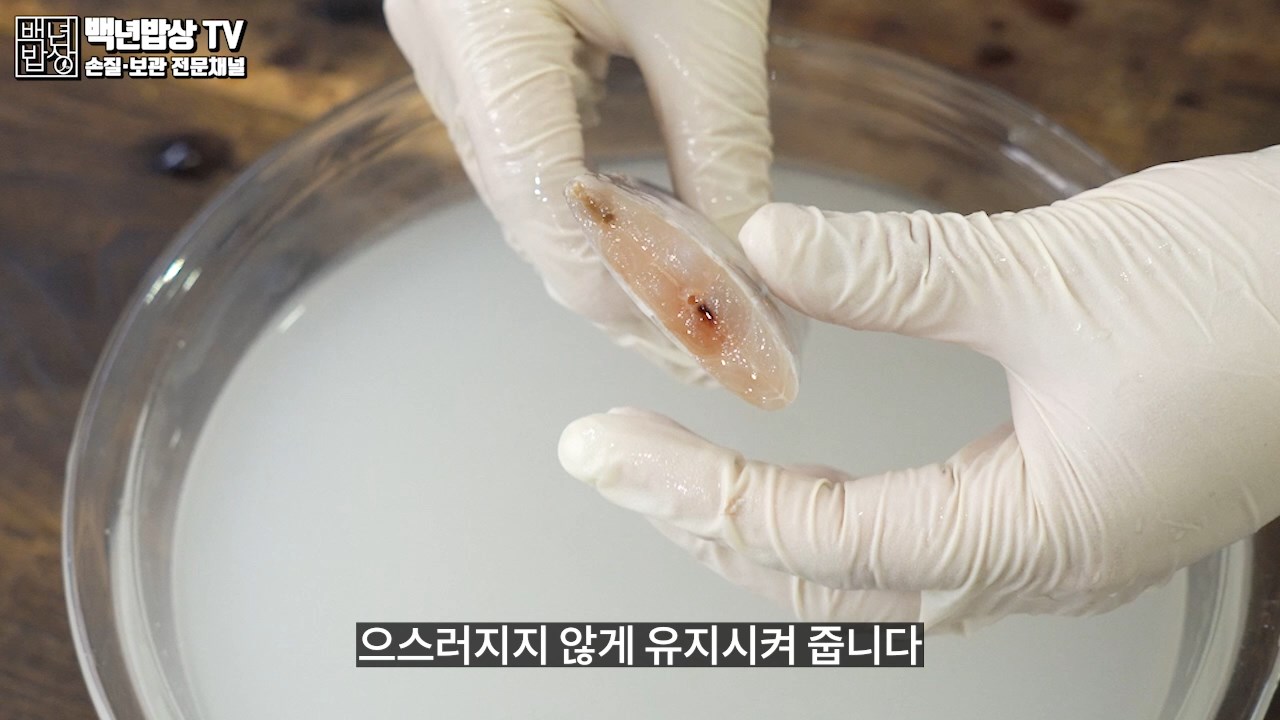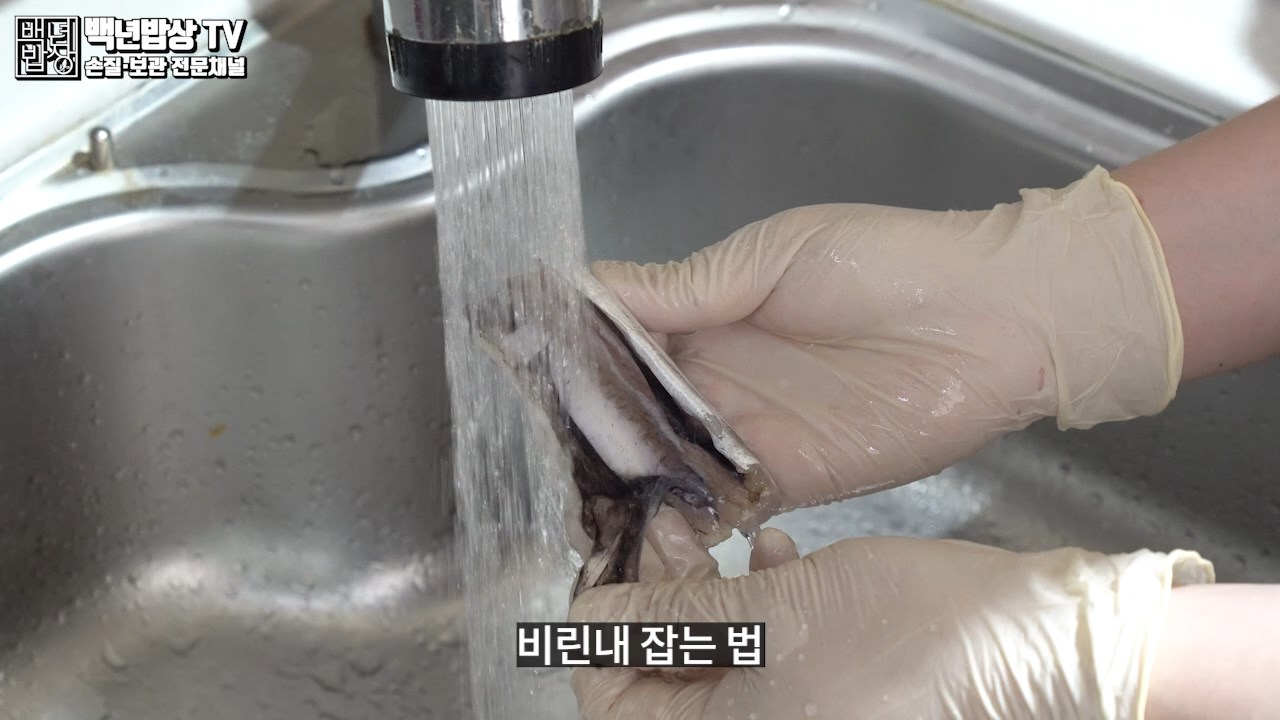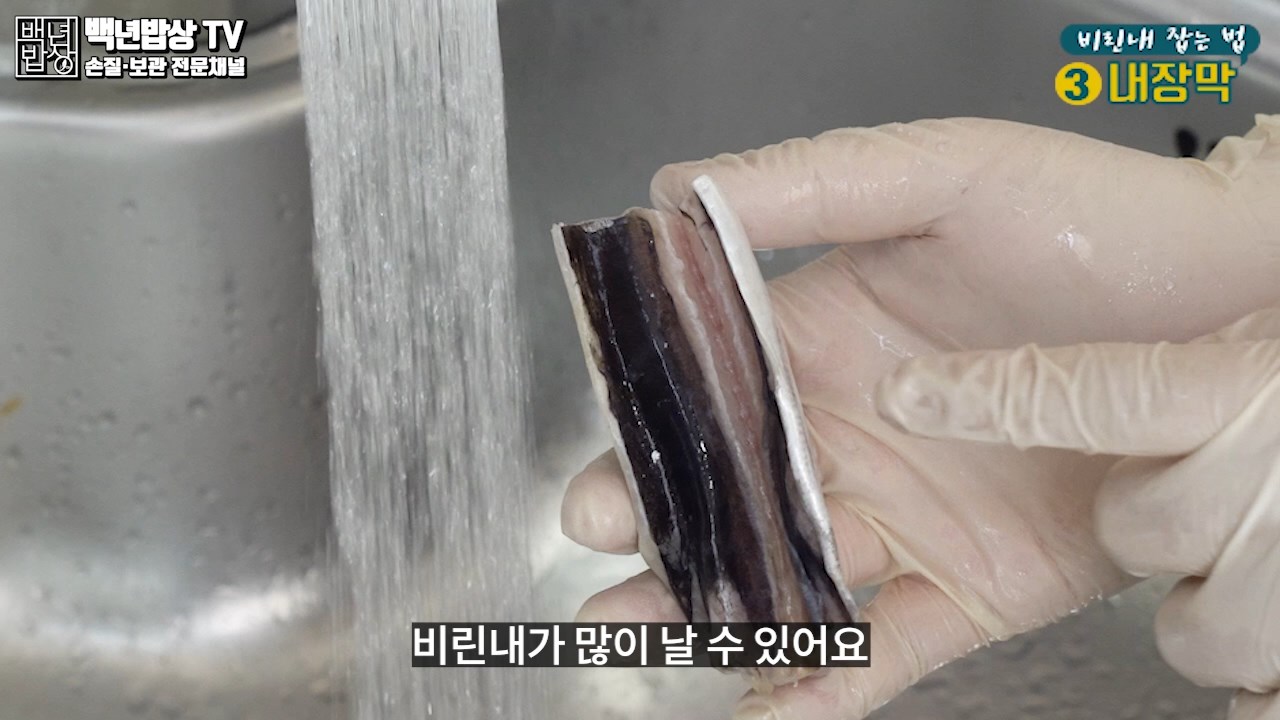 내장막은 내장이 닿아있던 부분으로 비린내가 많이 날 수 있어요. 배 부분에 검은색 내장막이 있다면, 세척하며 손으로 떼어내 주세요.