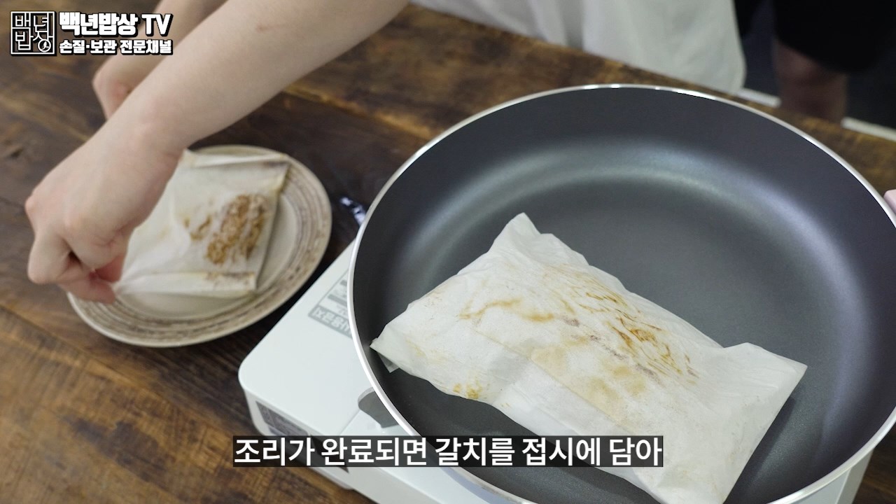 종이호일 테두리를 접어 주세요. 후라이팬을 달군 뒤 갈치를 올려 뚜껑을 닫아 중약불에서 구워 주세요. (센 불에서 조리하면 종이가 탈 수 있으니 주의하세요)