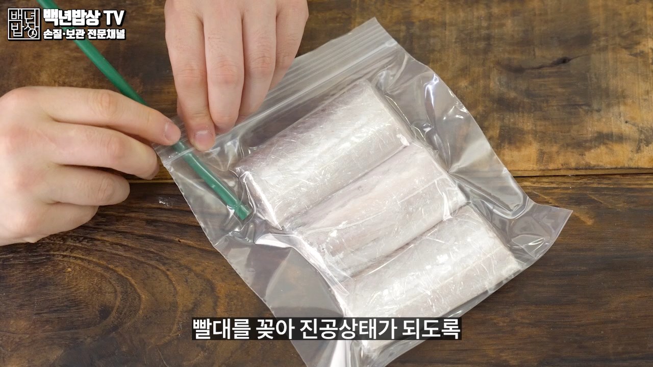 빨대를 꽂아 진공상태가 되도록 밀봉을 해 줍니다.