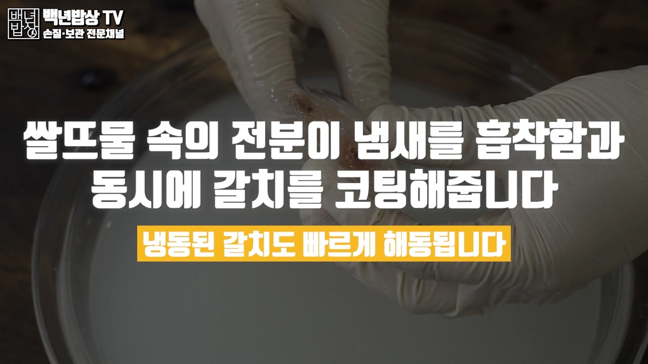 쌀뜨물은 흡착력이 좋아 잡냄새나 이물질을 제거해 주며 살을 부드럽게 하고 으스러지지 않게 유지시켜 줍니다! (쌀뜨물 속의 전분이 냄새를 흡착함과 동시에 갈치를 코팅해 줍니다) 냉동된 갈치도 빠르게 해동됩니다.