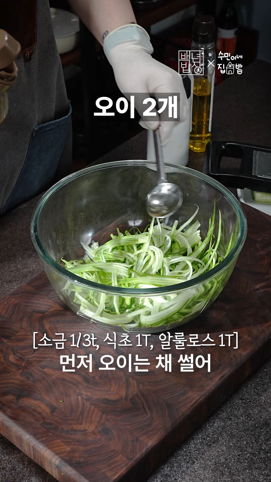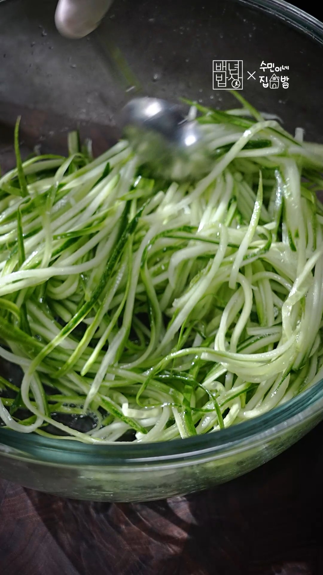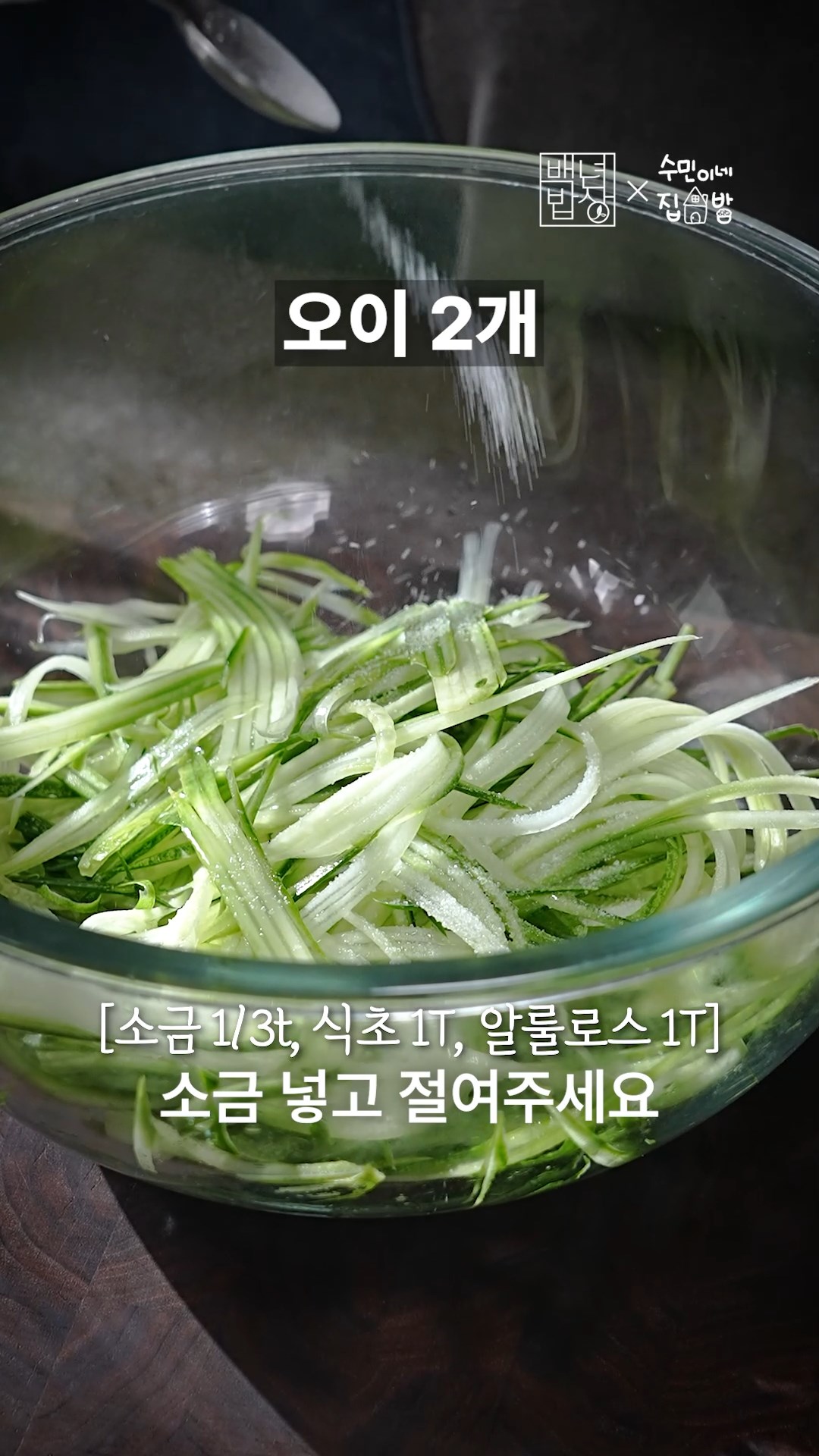 1. 오이는 채썰어 식초, 알룰로스, 소금 넣고 절여주세요