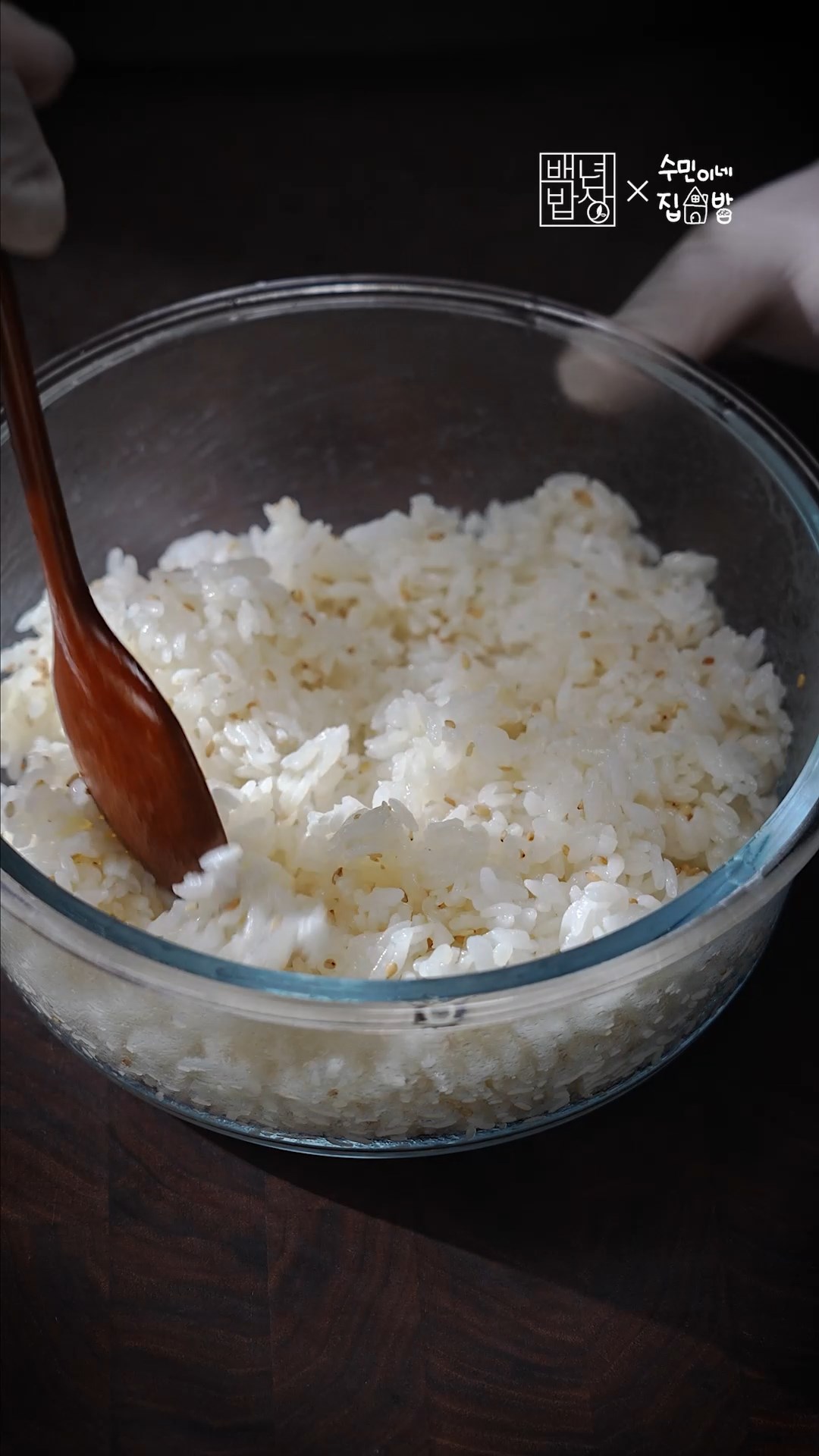 7. 김밥이 탱탱해지면 참기름 바르고 통깨 뿌려 잘라주면 완성!