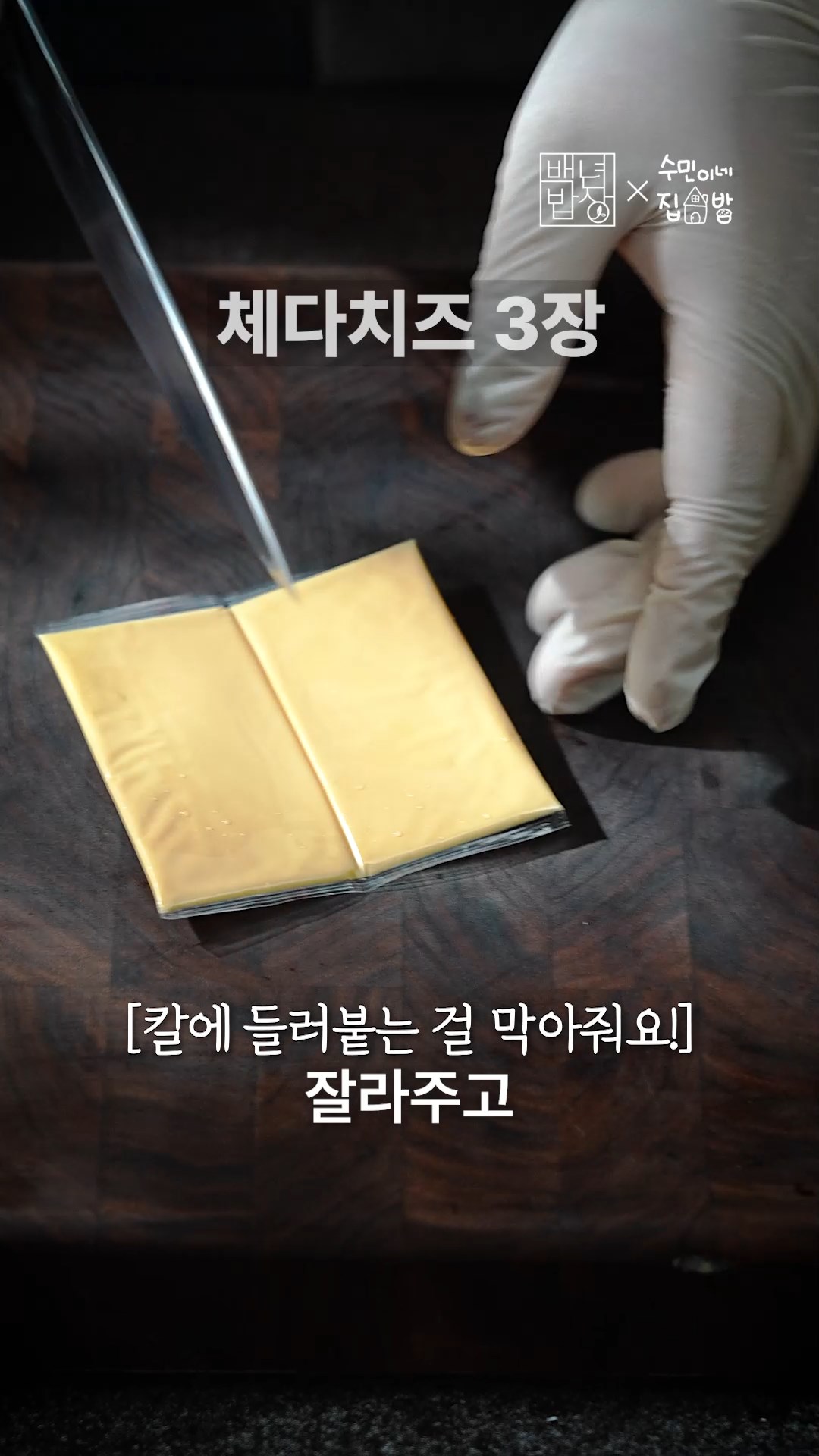 6. 치즈는 껍질 째로 칼집을 넣어 잘라주고 김에 밥, 자른김, 치즈, 오이, 스팸, 계란말이 넣어 말아주세요