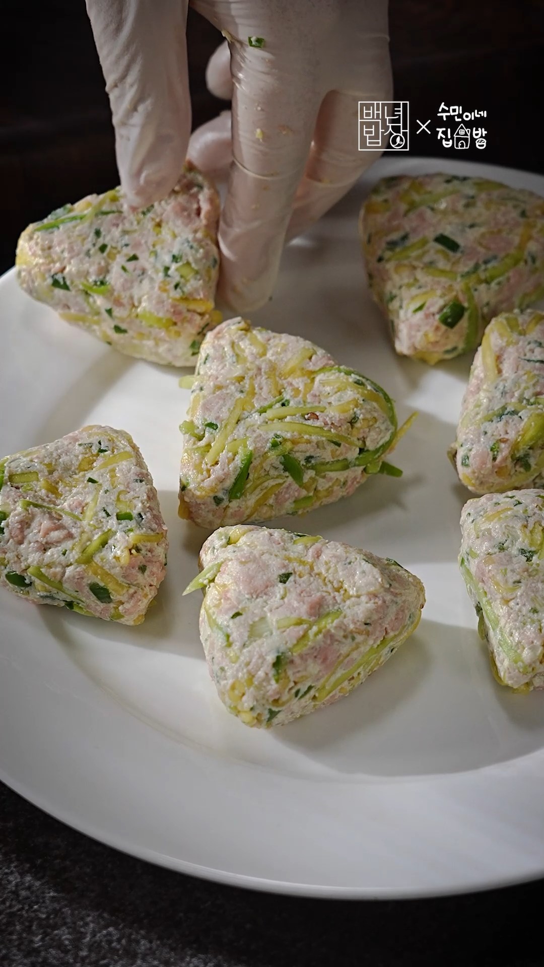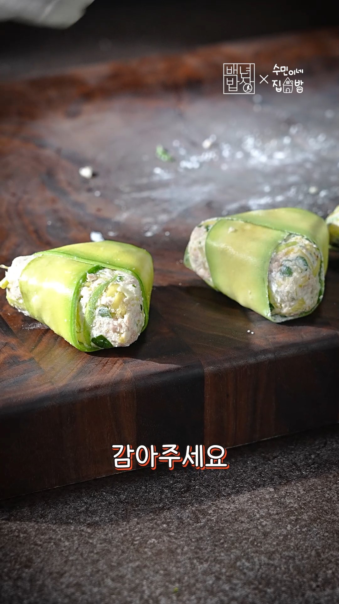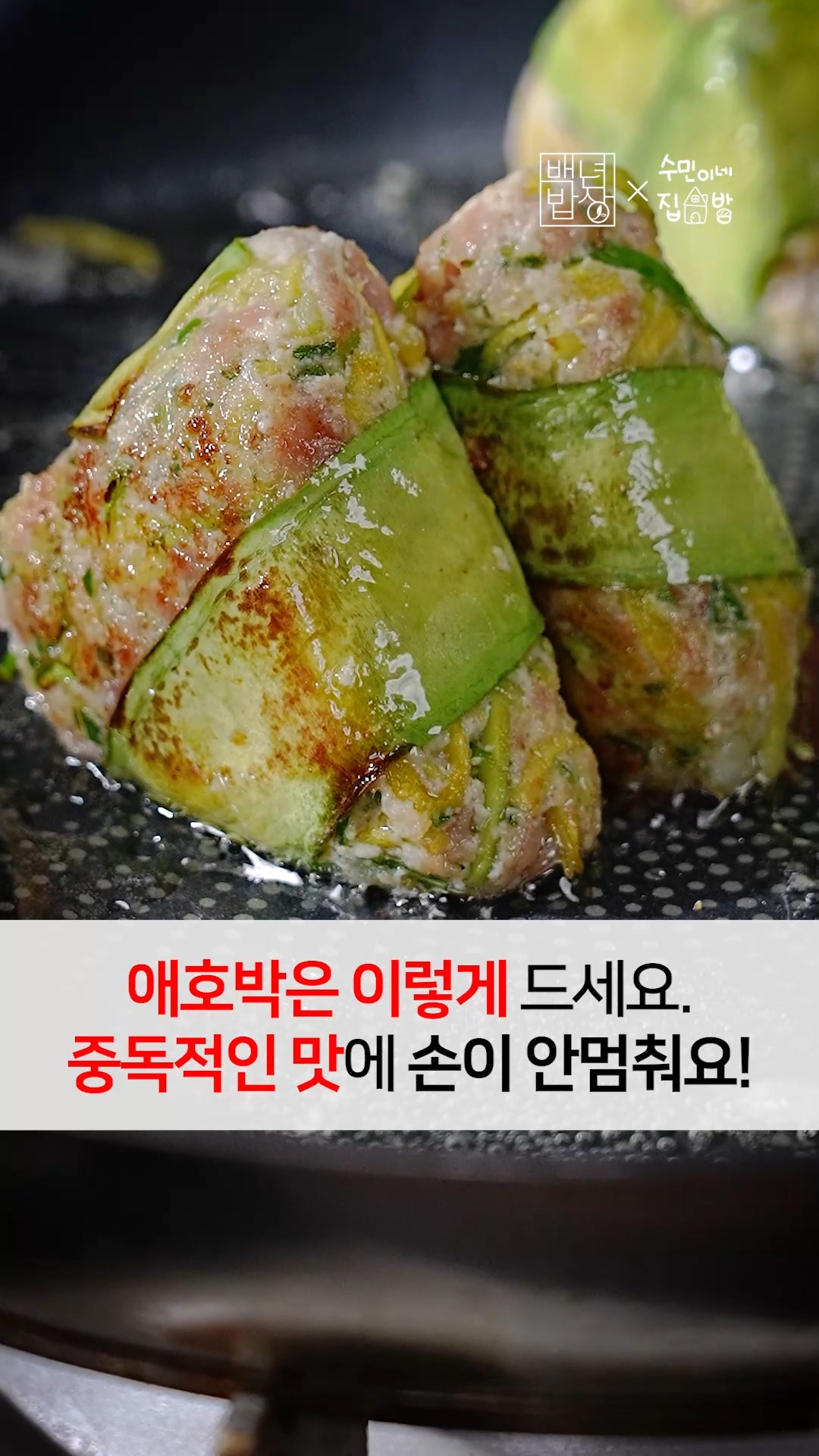 7. 만두소에 애호박을 감아주고 앞뒷면 노릇하게 구워주세요.