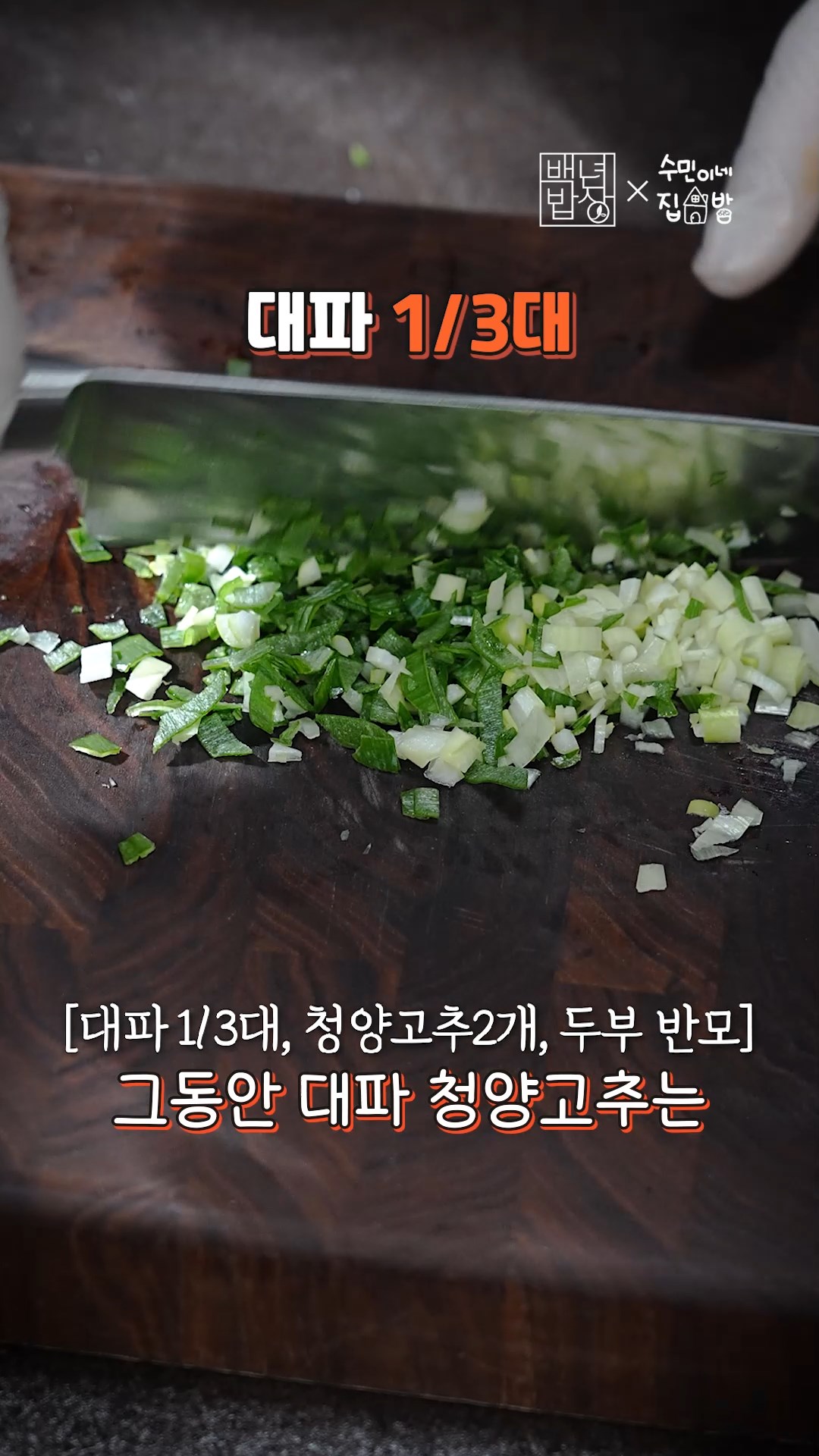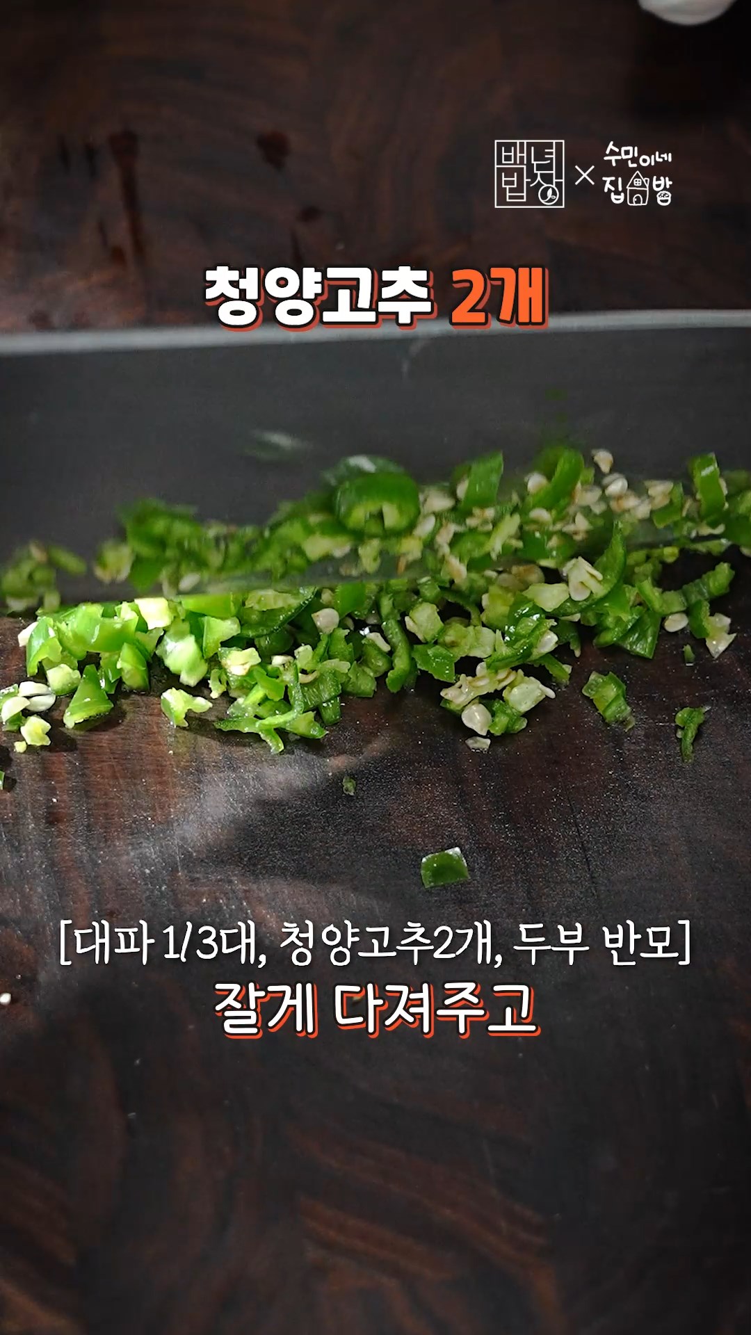 3. 그동안 대파, 청양고추는 잘게 다져주고 두부도 물기를 제거해주세요.