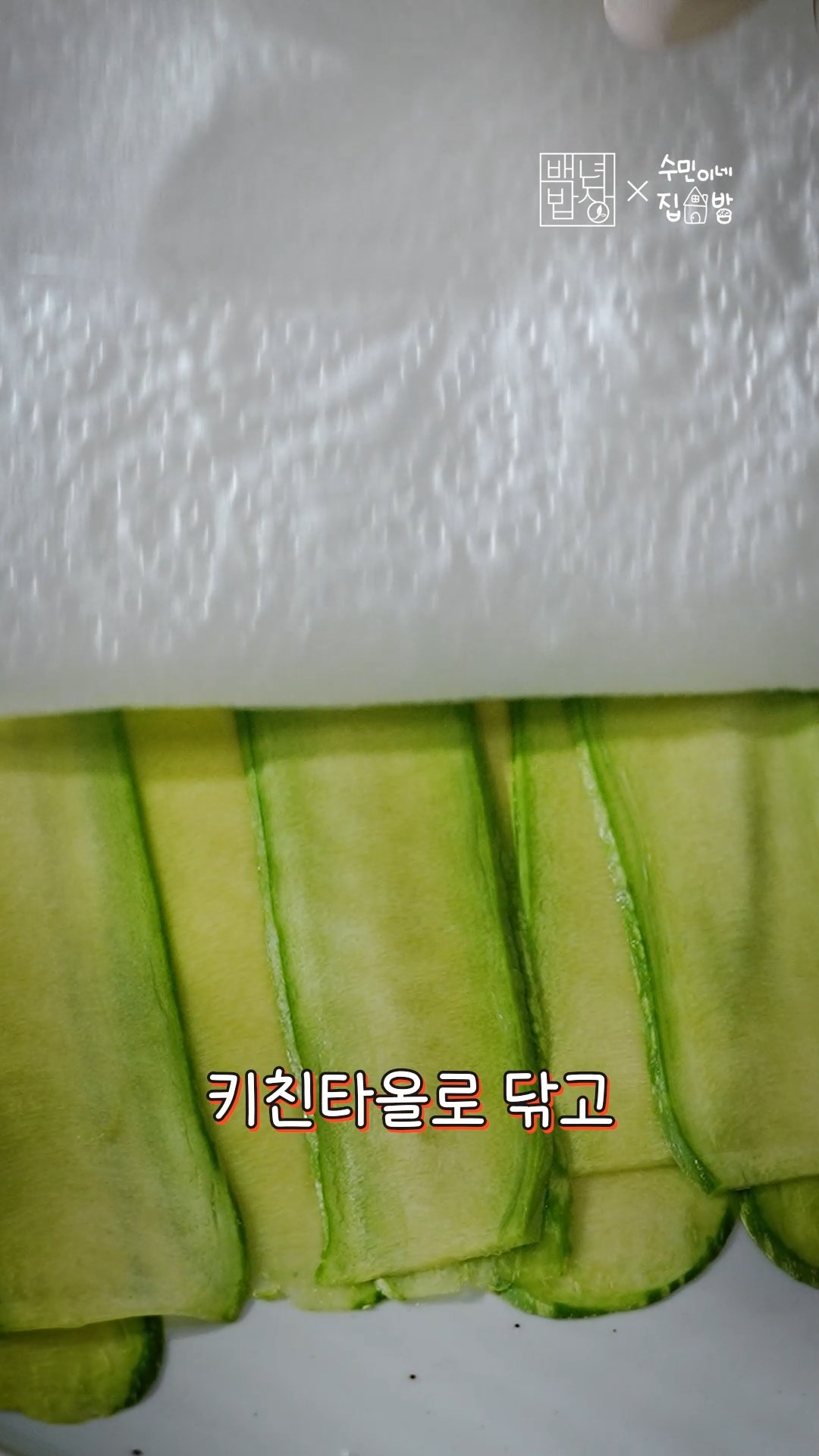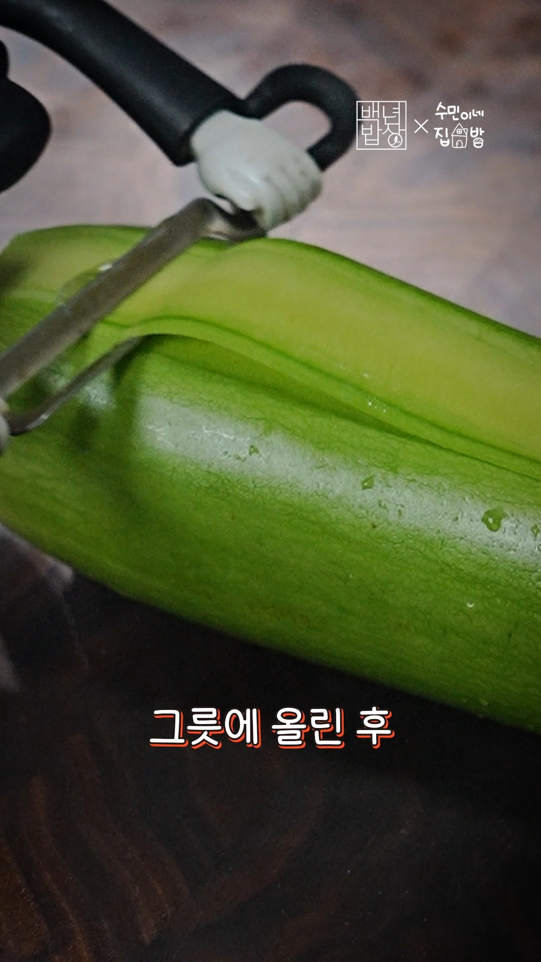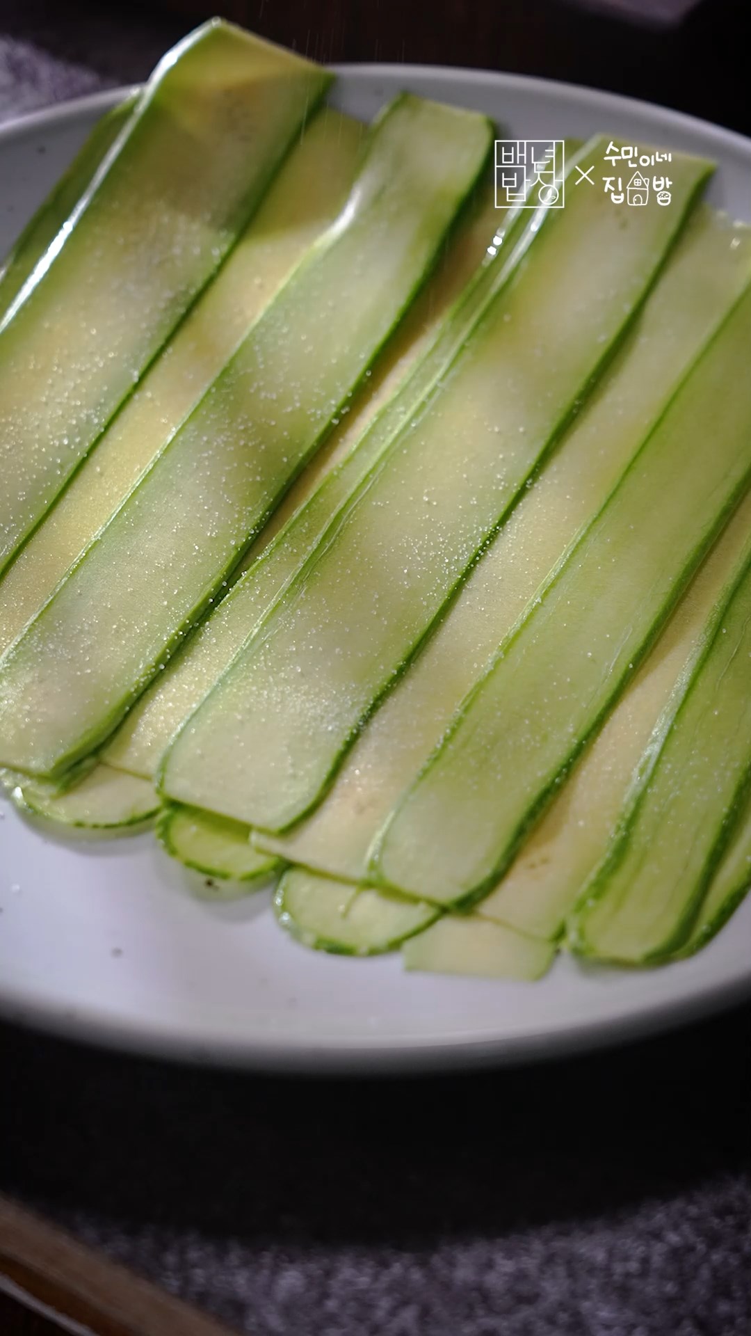 1. 애호박은 양 끝을 자르고 필러로 얇게 밀어 그릇에 옮긴 후 소금을 뿌려 절여주세요
