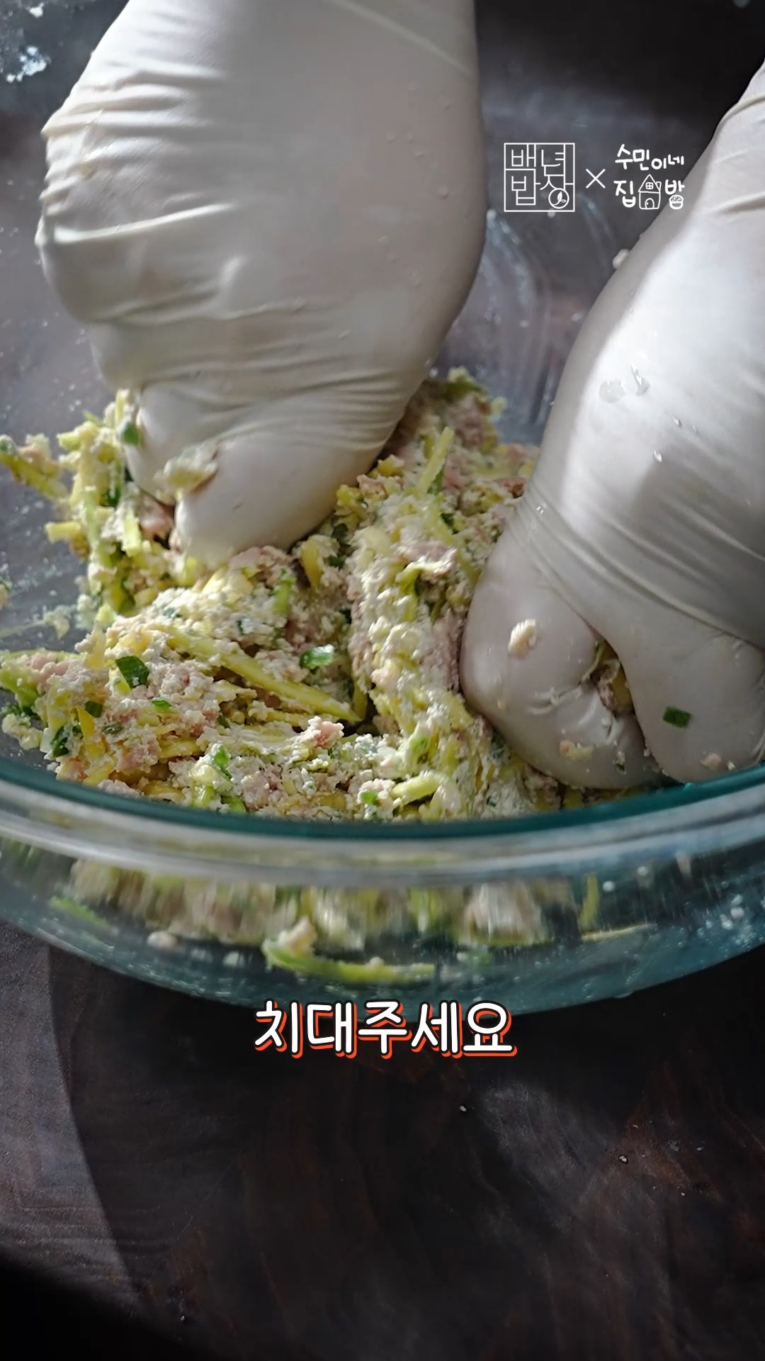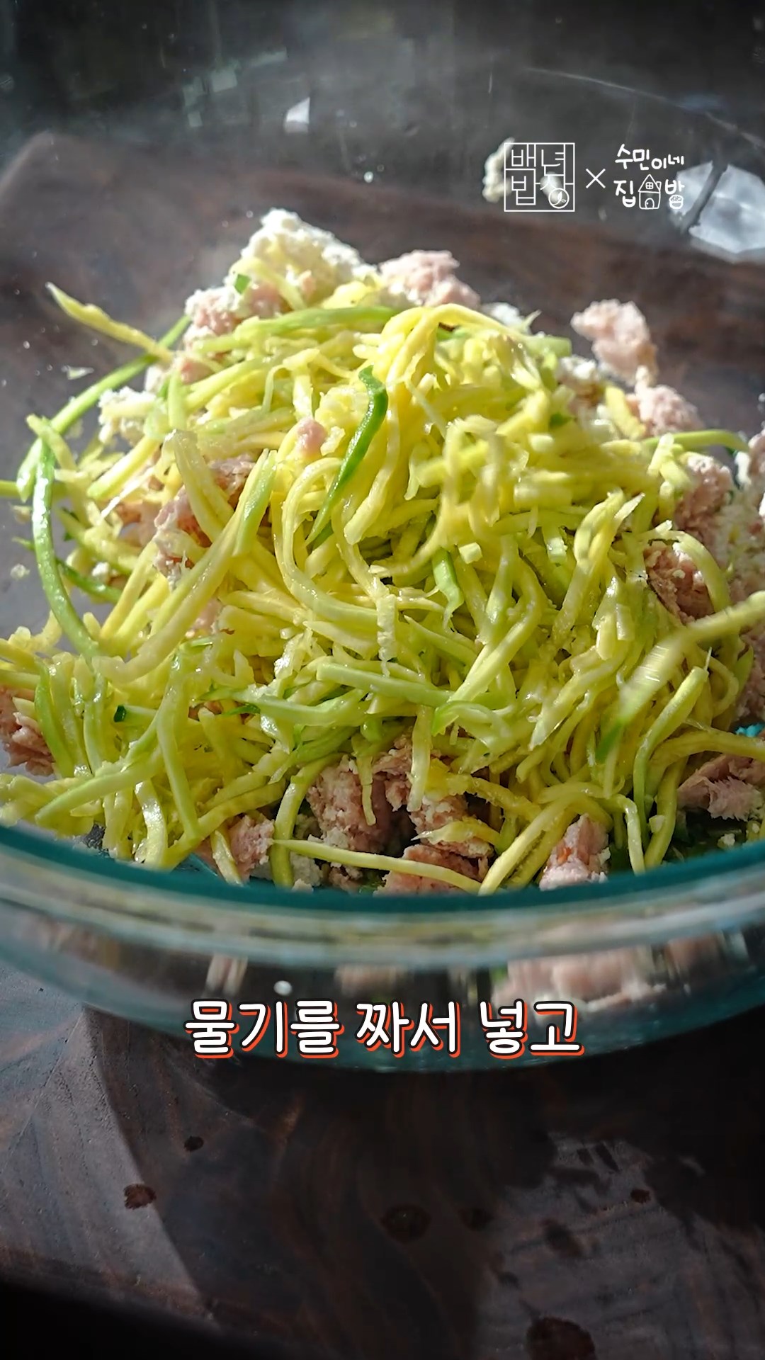 5. 채 썬 애호박은 손으로 물기를 짜서 넣고 손으로 반죽을 열심히 치대주세요.