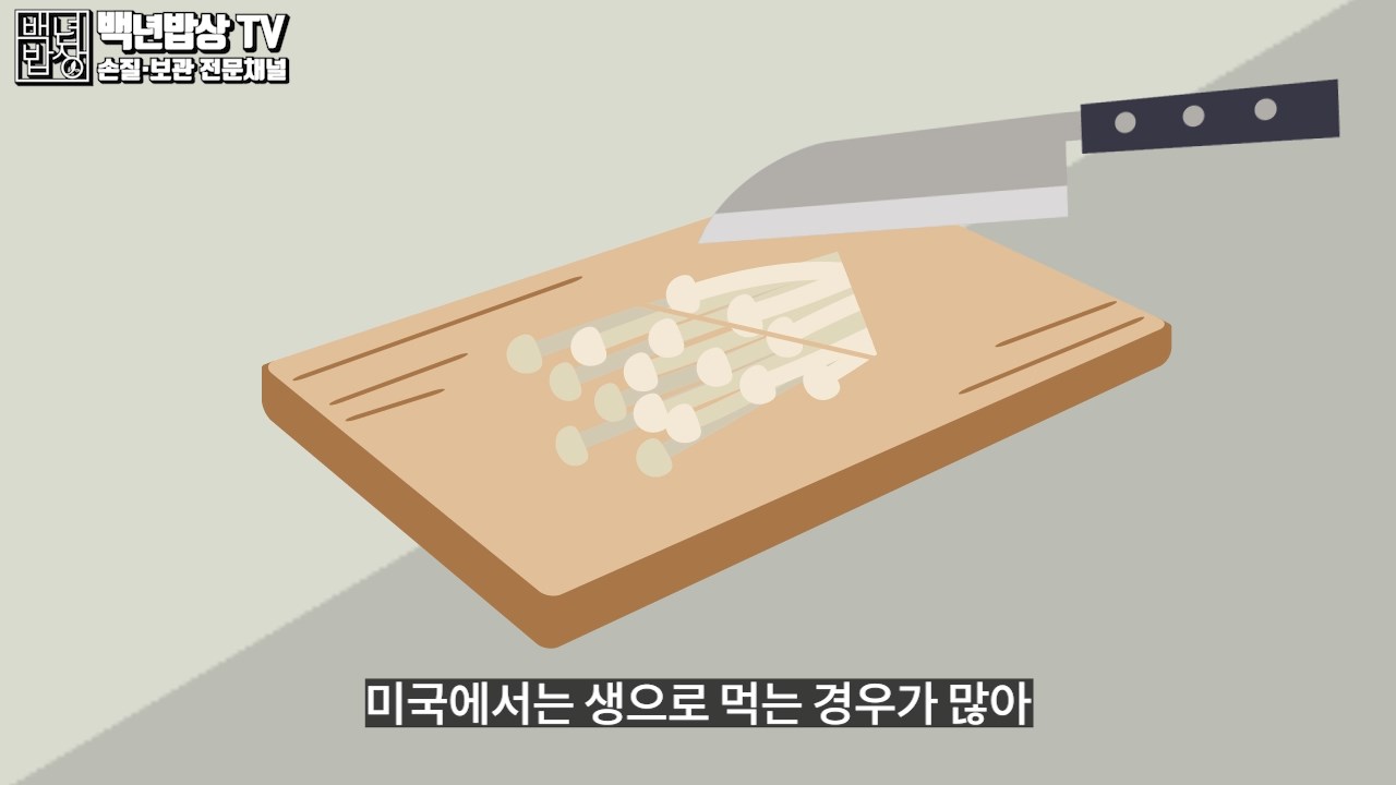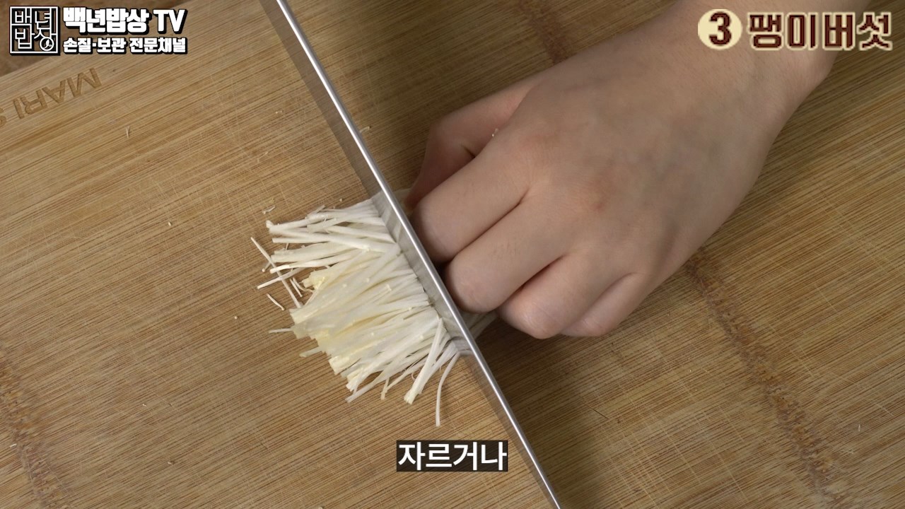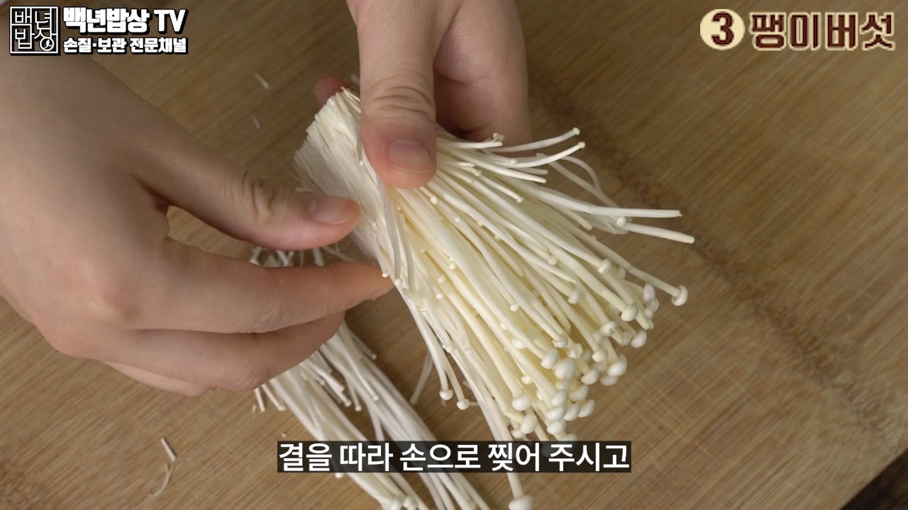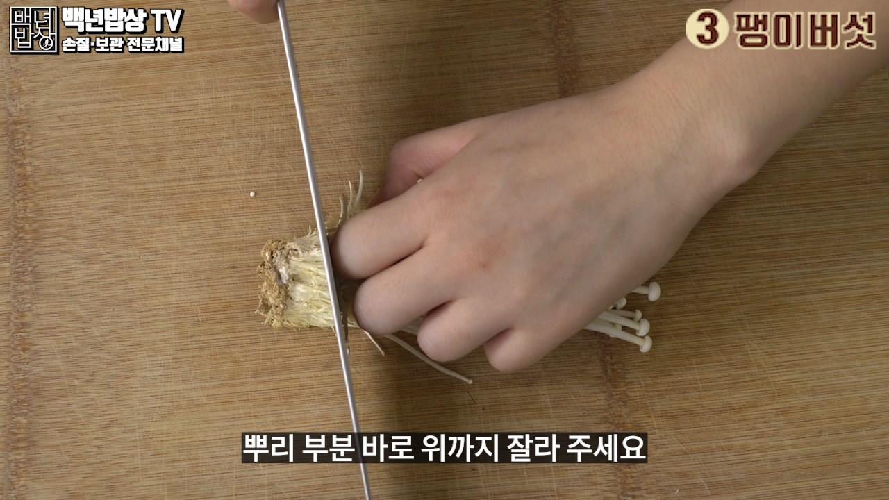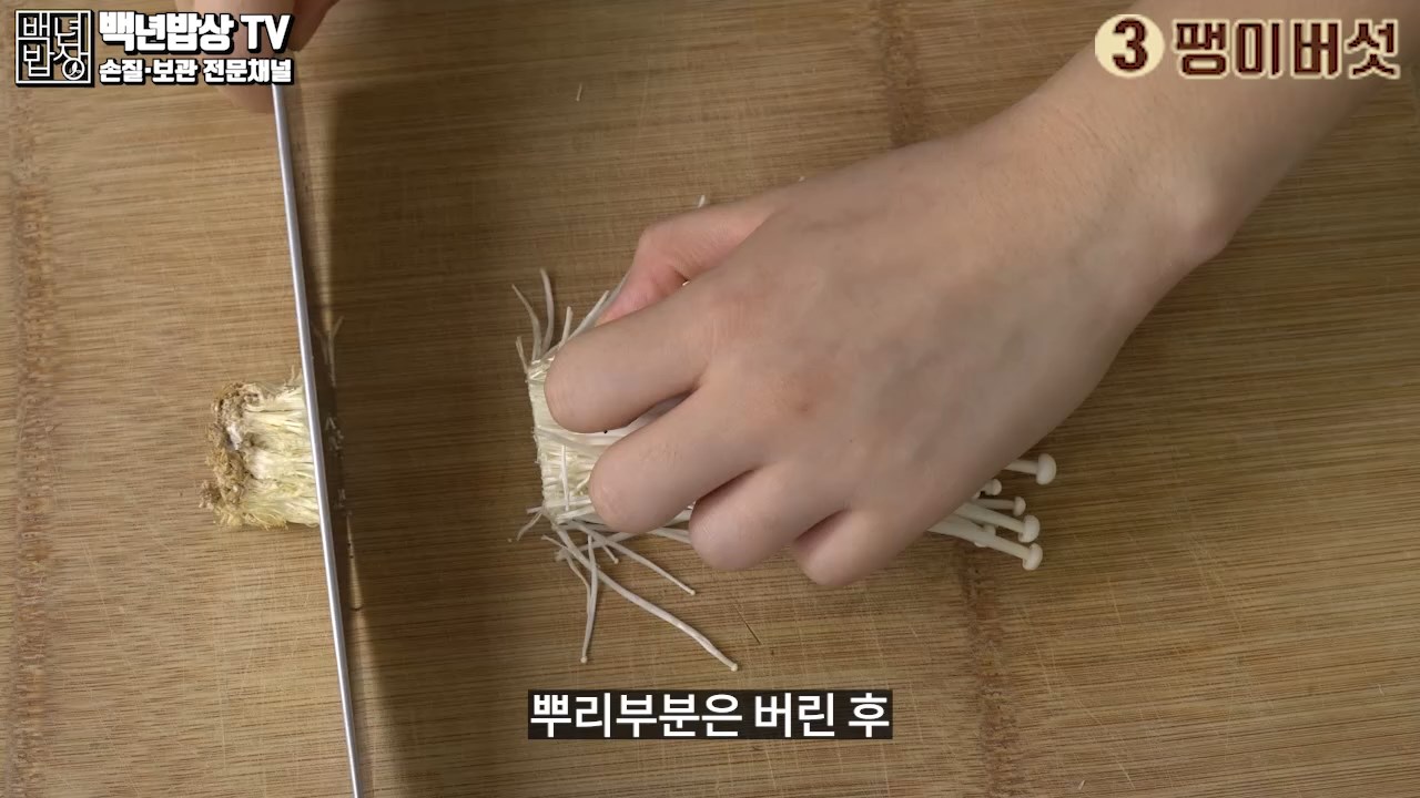 3. 팽이버섯 : 뿌리 부분 바로 위까지 잘라주세요. 뿌리 부분은 버린 후 결을따라 손으로 찢어주신 후 자르거나 그대로 사용해주세요.