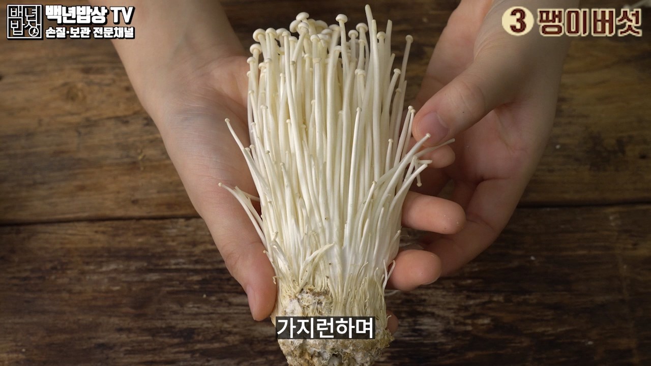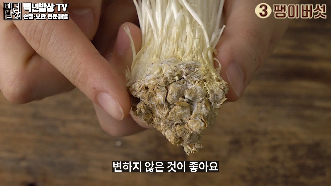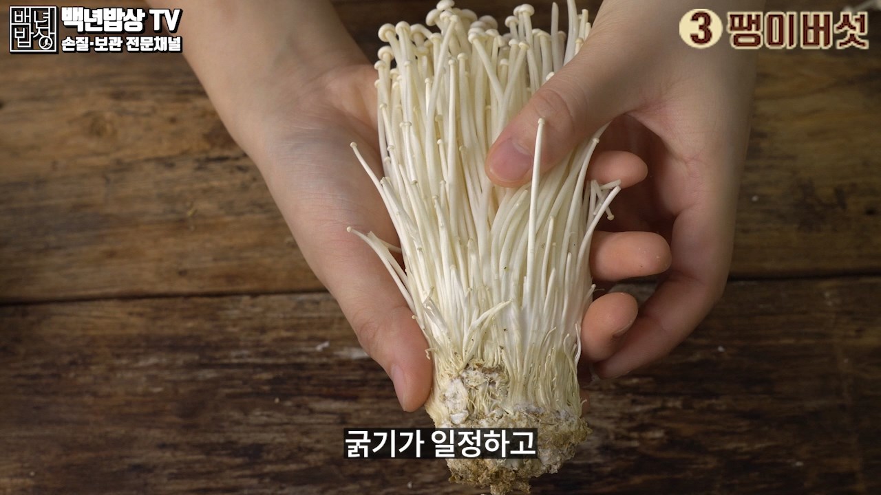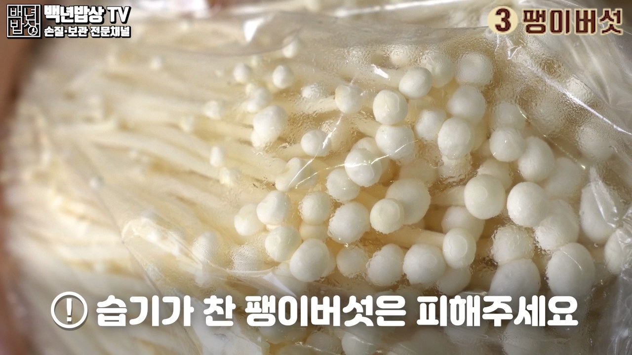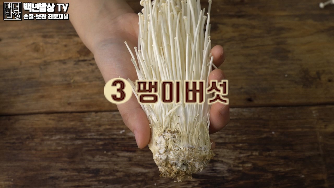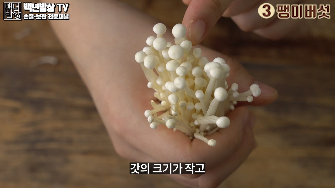 3. 팽이버섯 : 굵기가 일정하고 가지런하며, 갓 의 크기가 작고, 뿌리 부분이 짙은 갈색으로 변하지 않은 것이 좋아요. (습기가 찬 팽이버섯은 피해 주세요)