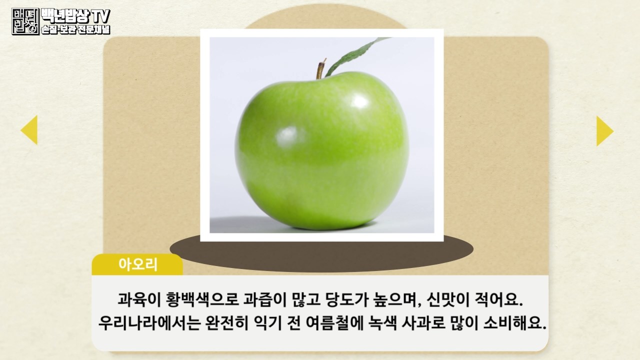아오리 : 과육이 황백색으로 과즙이 많고 당도가 높으며, 신맛이 적어요. 우리나라에서는 완전히 익기 전 여름철에 녹색 사과로 많이 소비해요.