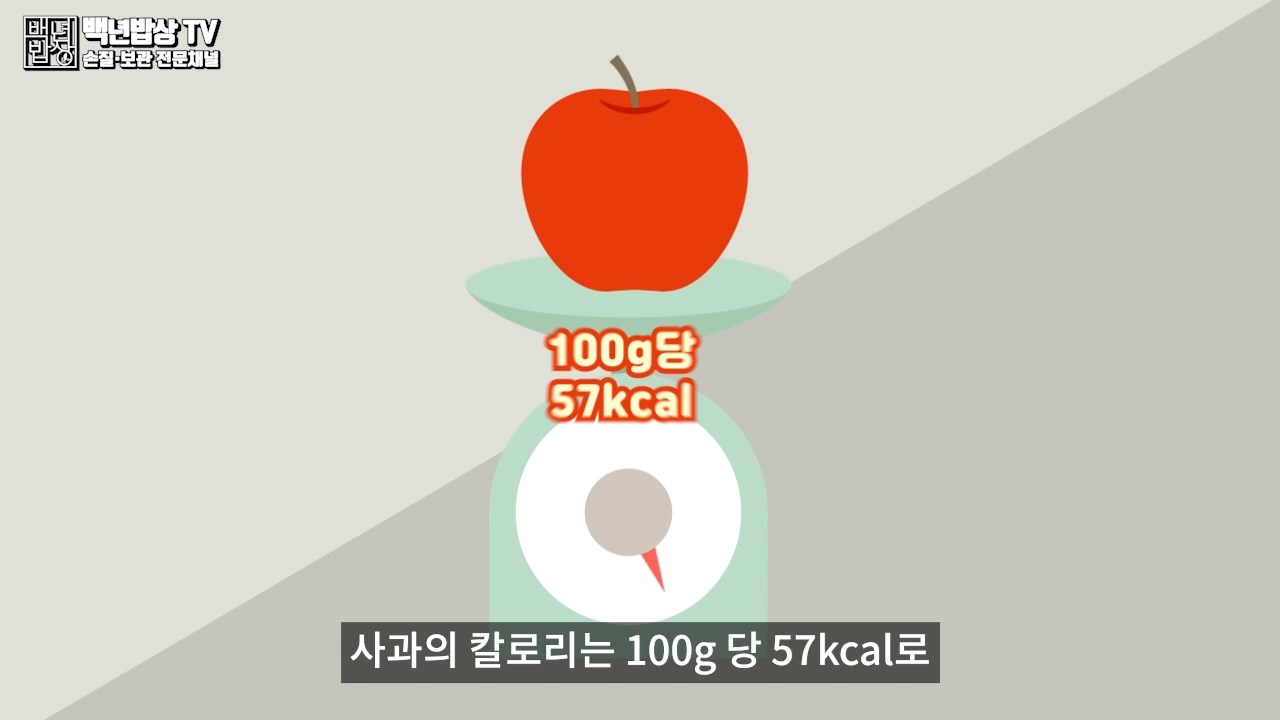2. 다이어트 : 사과의 칼로리는 100g당 57kcal로 다른 과일에 비해 다소 높은 편입니다. 사과 두 개를 먹으면 밥 한 공기와 같은 칼로리예요.