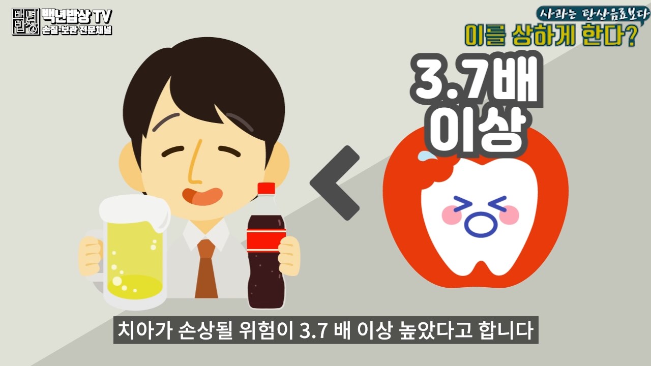 영국 킹스칼리지 런던 치과 연구소의 연구결과에 따르면 사과에는 당분과 산성분이 많아 탄산음료를 마시거나 음주를 하는 것보다 치아가 손상될 위험이 3.7배 이상 높았다고 합니다.