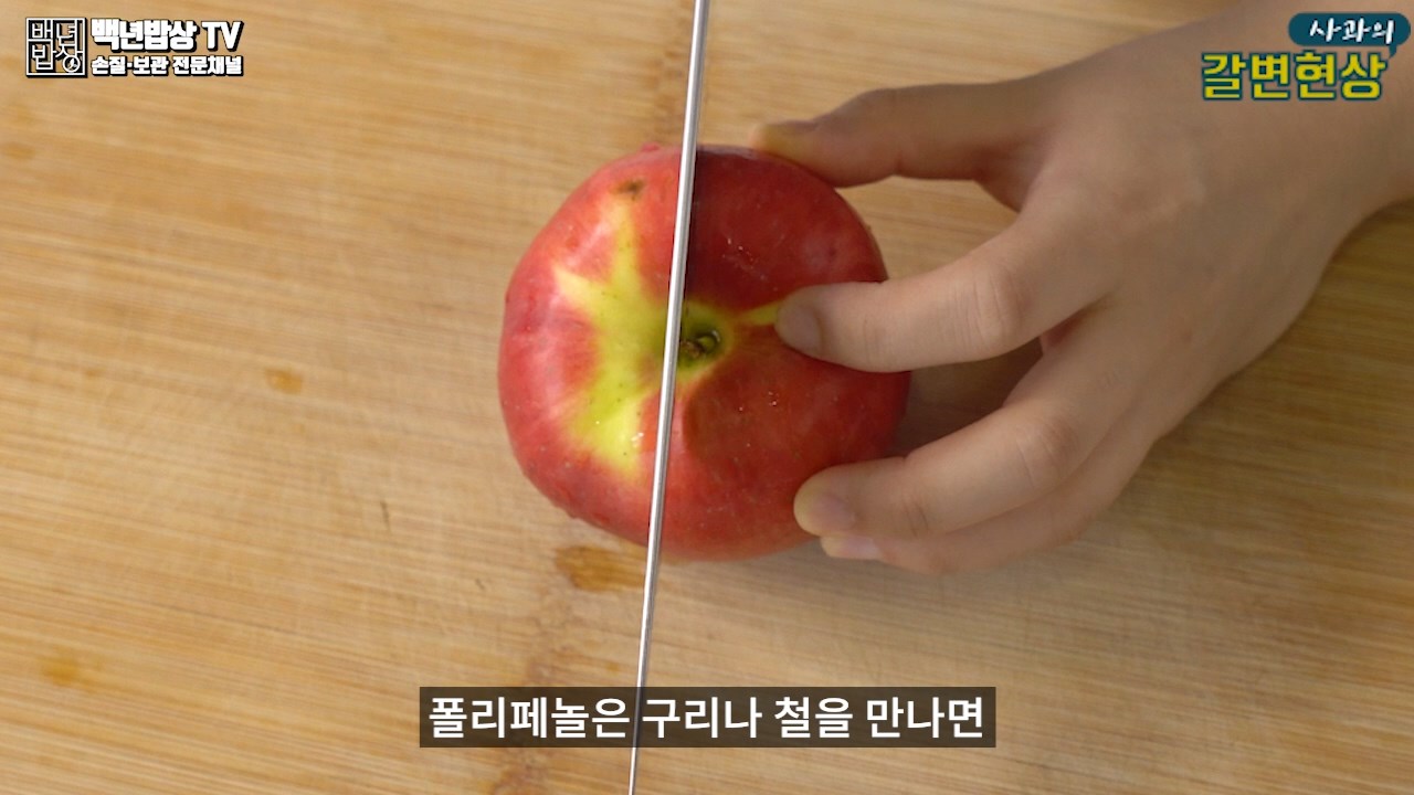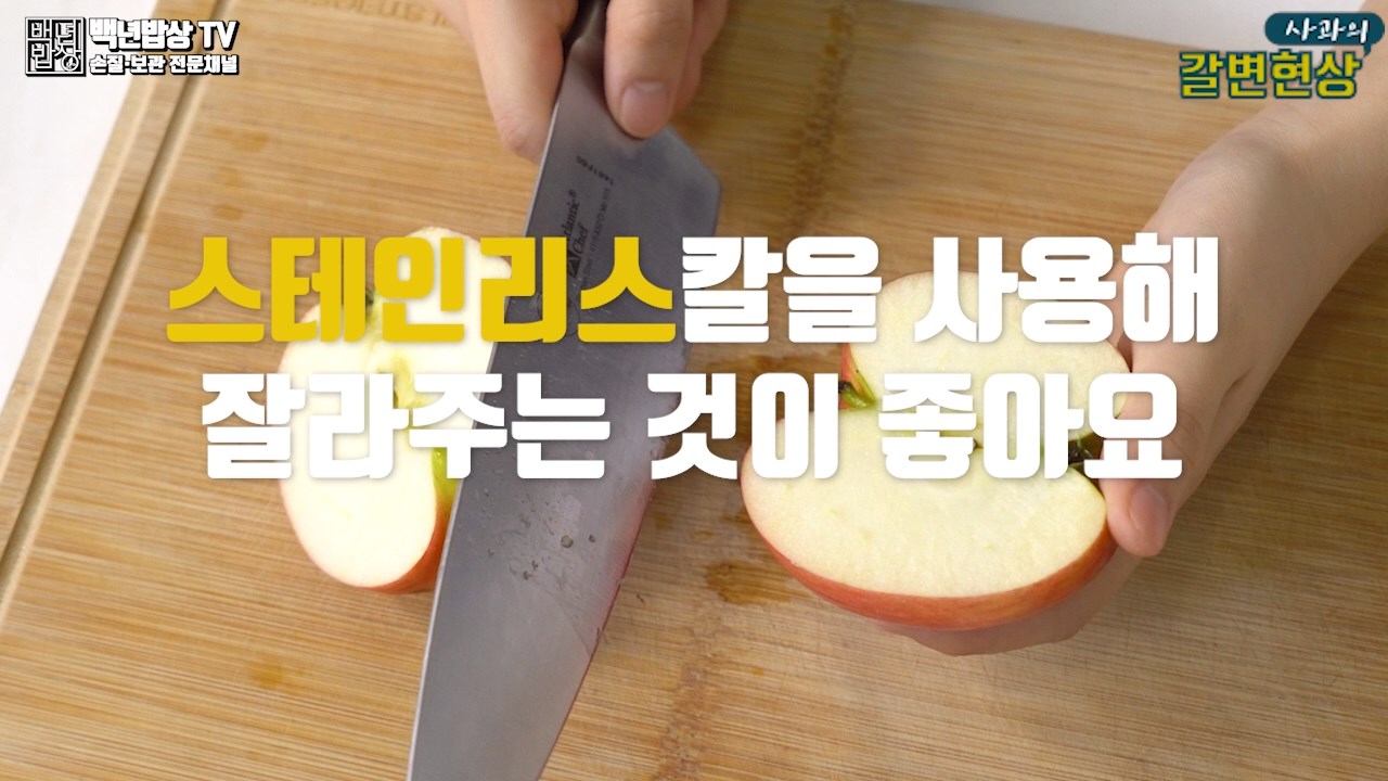 사과가 갈변 되는 이유는 사과 속 폴리페놀 성분이 산소와 만나 산화 효소 작용이 일어나기 때문입니다. 폴리페놀은 구리나 철을 만나면 산화 반응이 활성화되기 때문에 사과 갈변 막는법으로 스테인리스 칼을 사용해 잘라주는 것이 좋아요!