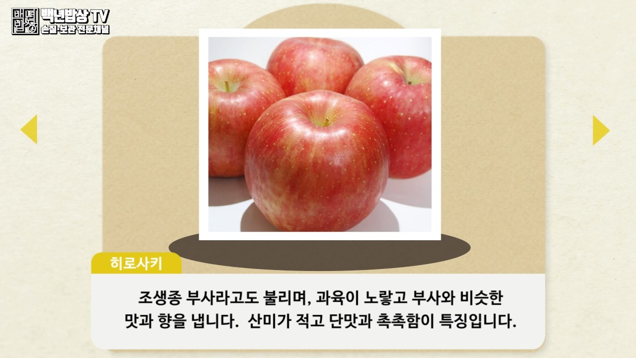 히로사키 : 조생종 부사라고도 불리며, 과육이 노랗고 부사와 비슷한 맛과 향을 냅니다. 산미가 적고 단맛과 촉촉함이 특징입니다.