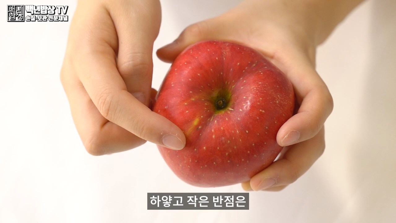 하얗고 작은 반점은 광합성 작용에 의해 생기는 것으로 반점이 많은 사과일수록 당도가 높아요.