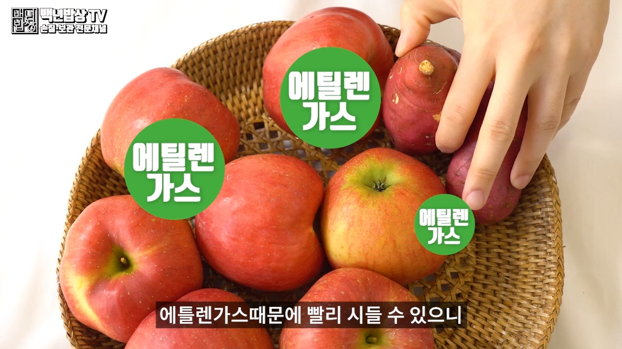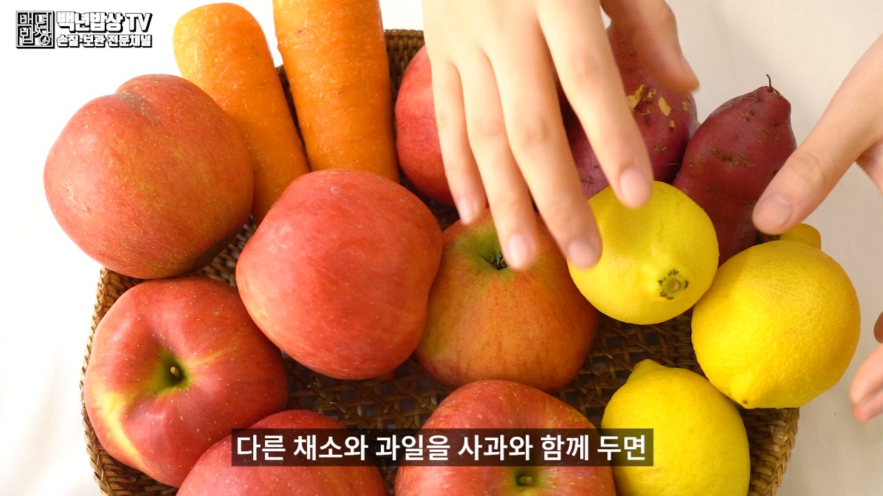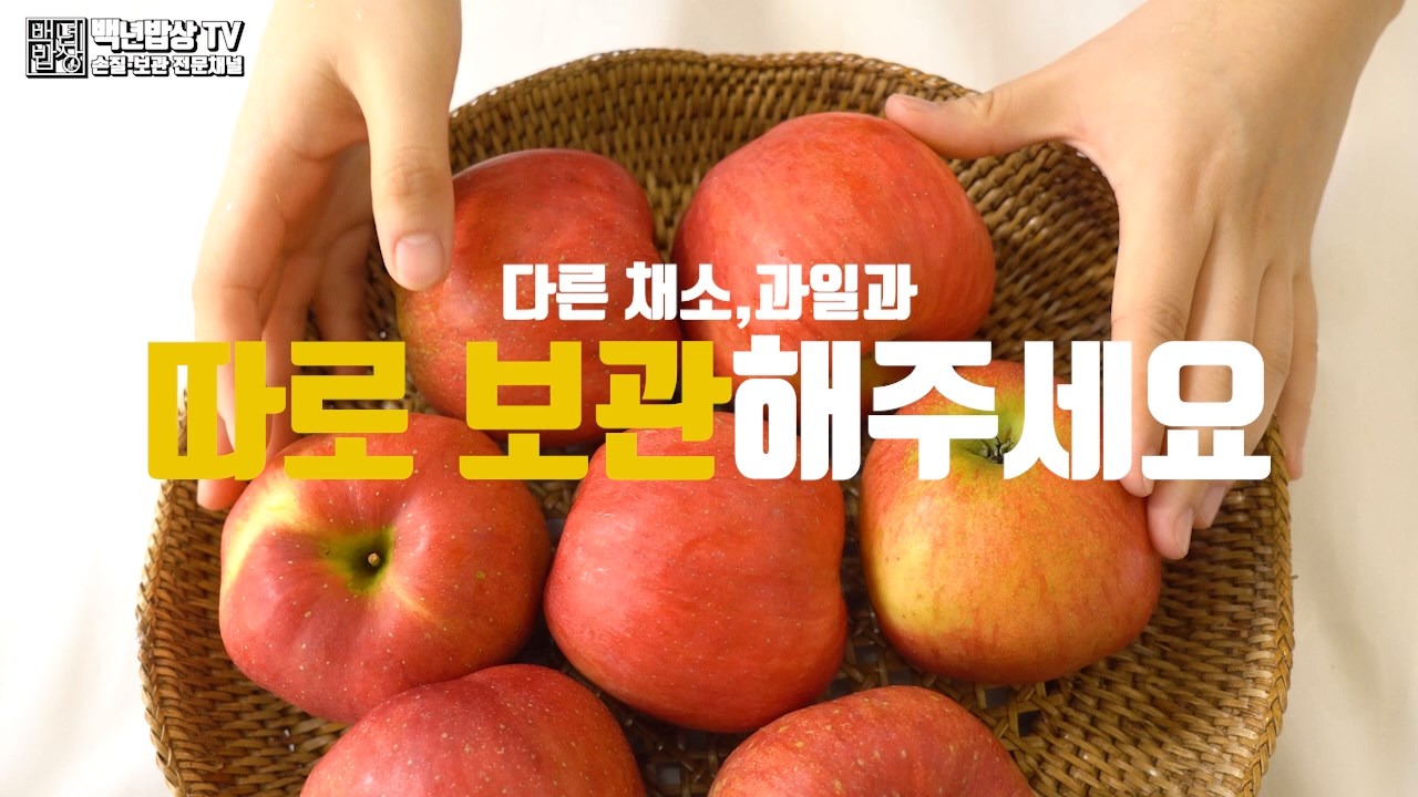 사과 보관법으로, 다른 채소와 과일을 사과와 함께 두면 에틸렌가스때문에 빨리 시들 수 있으니 따로 보관해주세요.
