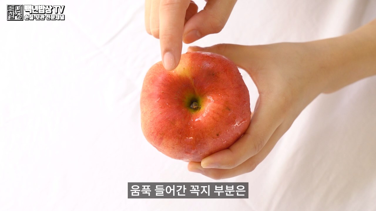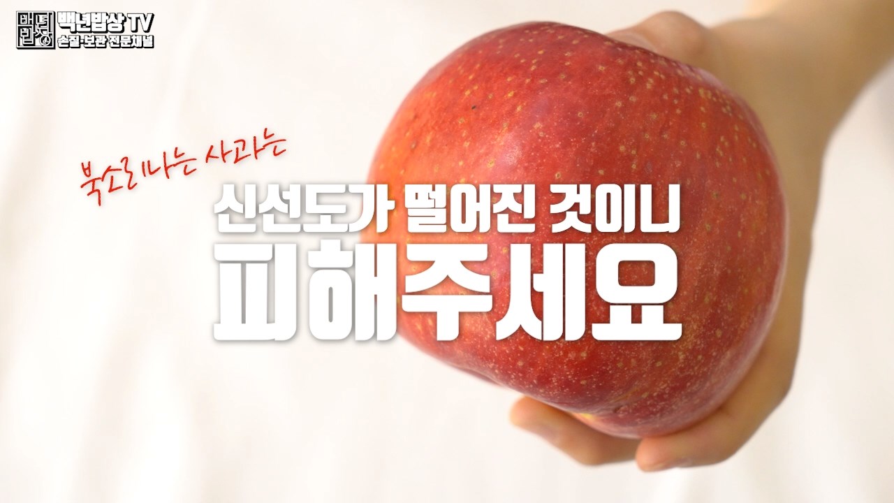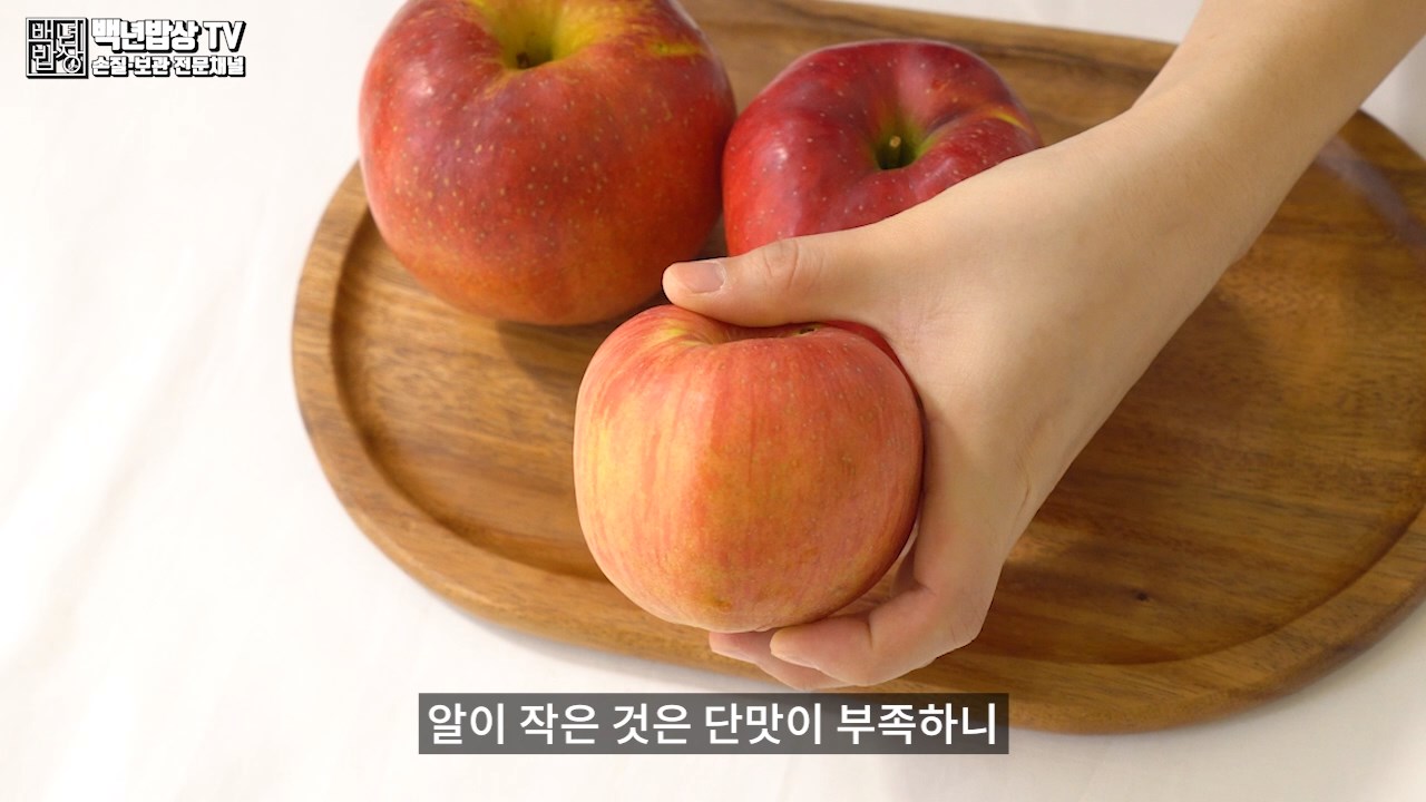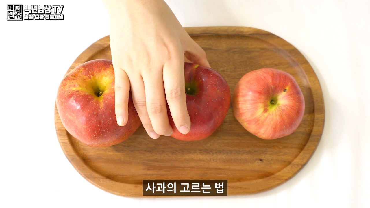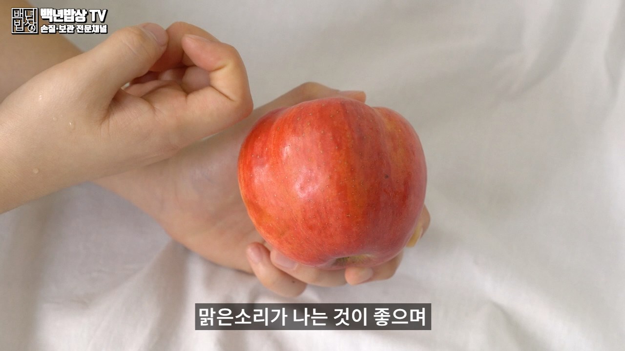 사과를 두드렸을 때 맑은소리가 나는 것이 좋으며, 북소리 같은 소리가 난다면 신선도가 떨어진 것이니 피해 주세요. 탱탱한 소리가 나는 것은 육질이 단단한 것으로, 수확 후 수분 소모가 적다는 것을 의미합니다.