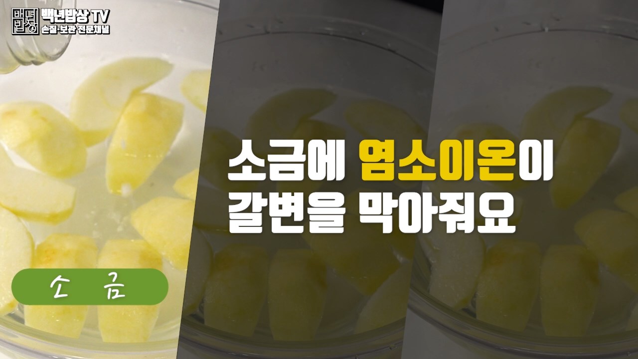 1. 소금물 : 소금에 있는 염소이온이 갈변현상을 억제해 갈변을 막아줘요.