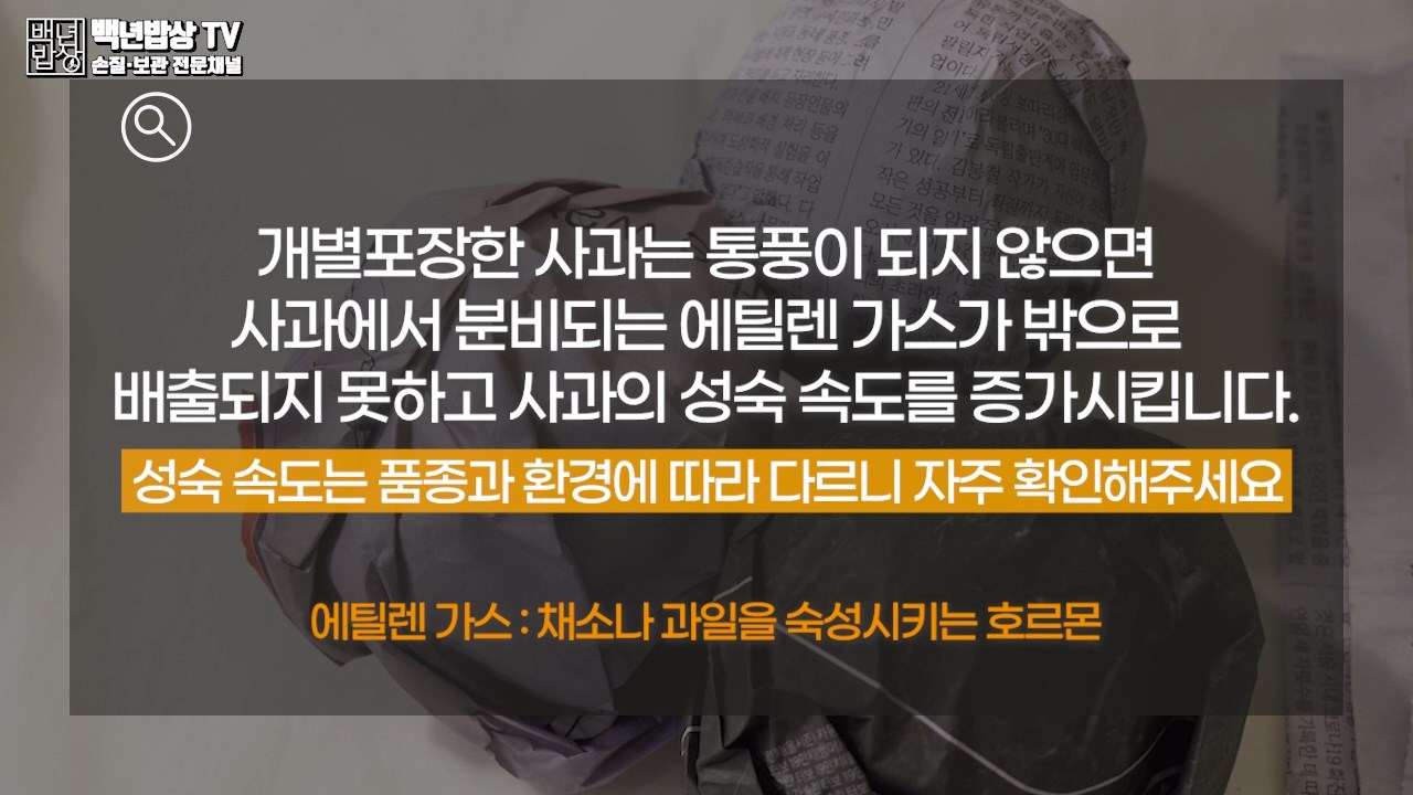 개별포장한 사과는 통풍이 되지 않으면 사과에서 분비되는 에틸렌가스가 밖으로 배출되지 못하고, 사과의 성숙 속도를 증가시킵니다. 성숙 속도는 품종과 환경에 따라 다르니 자주 확인해주세요. (에틸렌가스 : 채소나 과일을 숙성시키는 호르몬)