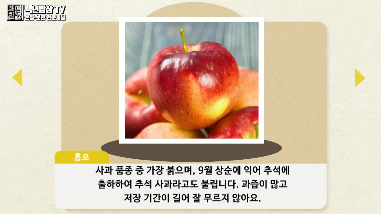 홍로 : 사과 품종 중 가장 붉으며, 9월 상순에 익어 추석에 출하하여 추석 사과라고도 불립니다. 과즙이 많고 저장 기간이 길어 잘 무르지 않아요.