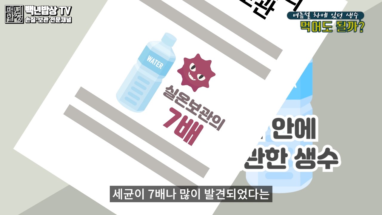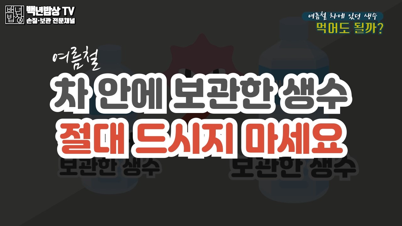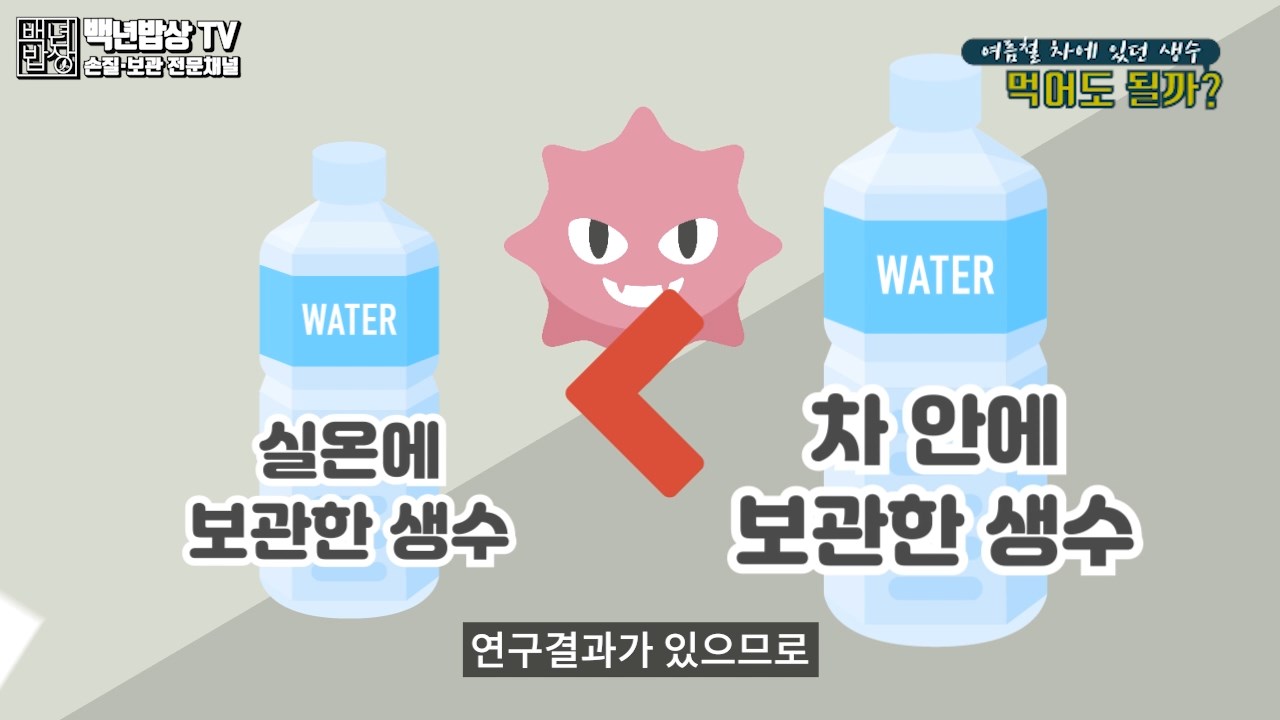 여름철 생수를 차 안에 두게 되면 차 내부 온도가 높아지면서 세균이 번식하기 좋은 환경이 되고, 실온에 보관한 물보다 세균이 7배나 많이 발견되었다는 연구 결과가 있으므로 절대 드시지 마세요.