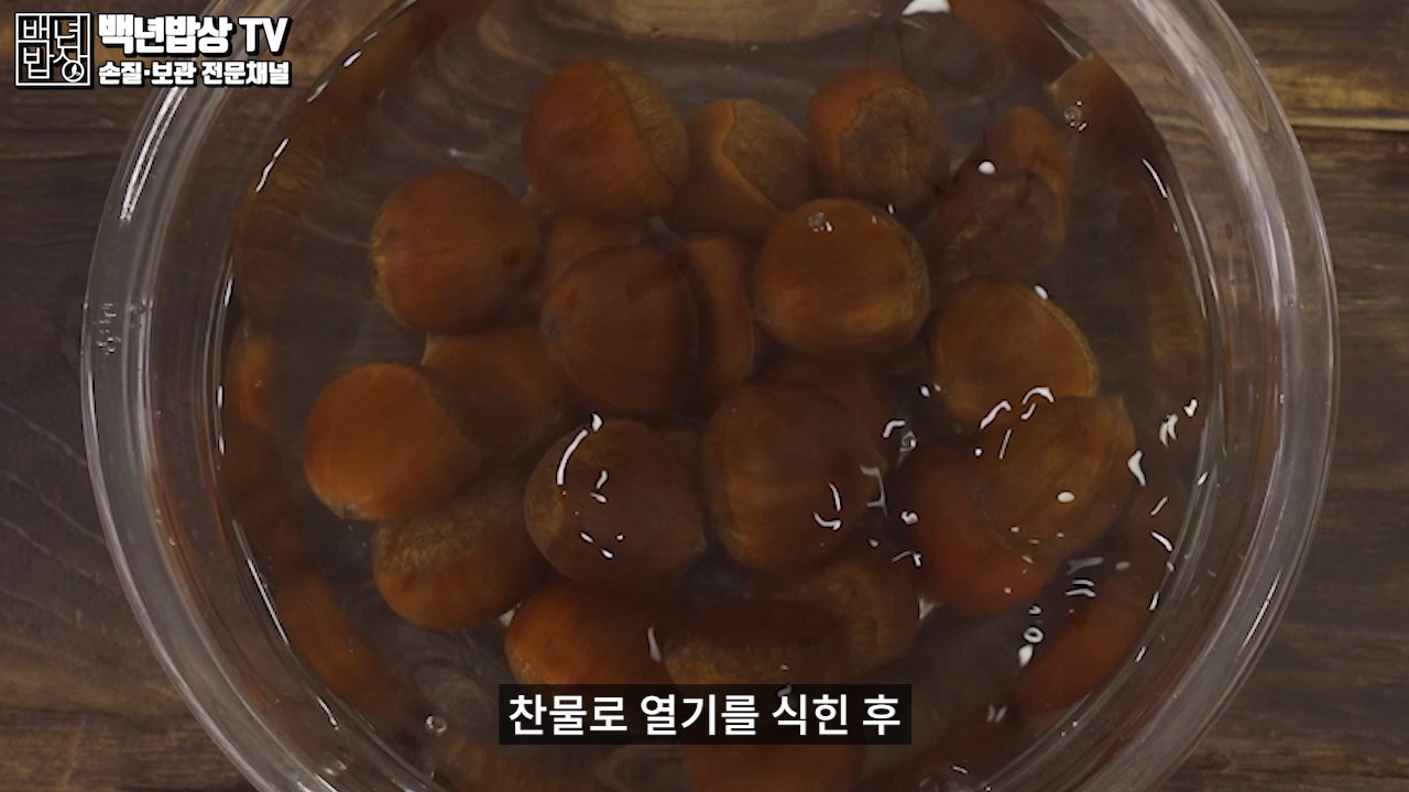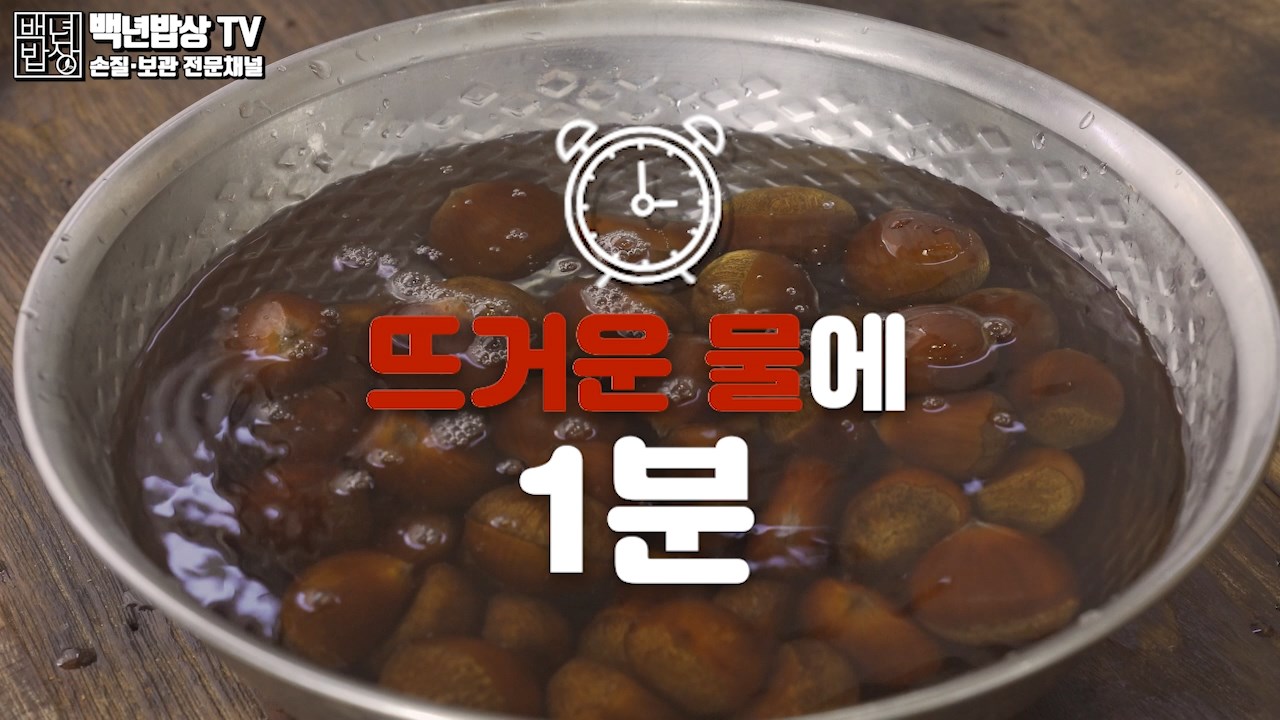 뜨거운 물로 밤을 1분 정도 데쳐주세요. 살짝 데치면 균 번식을 억제하여 밤이 썩지 않고, 벌레가 생기지 않아 오래 보관할 수 있어요.