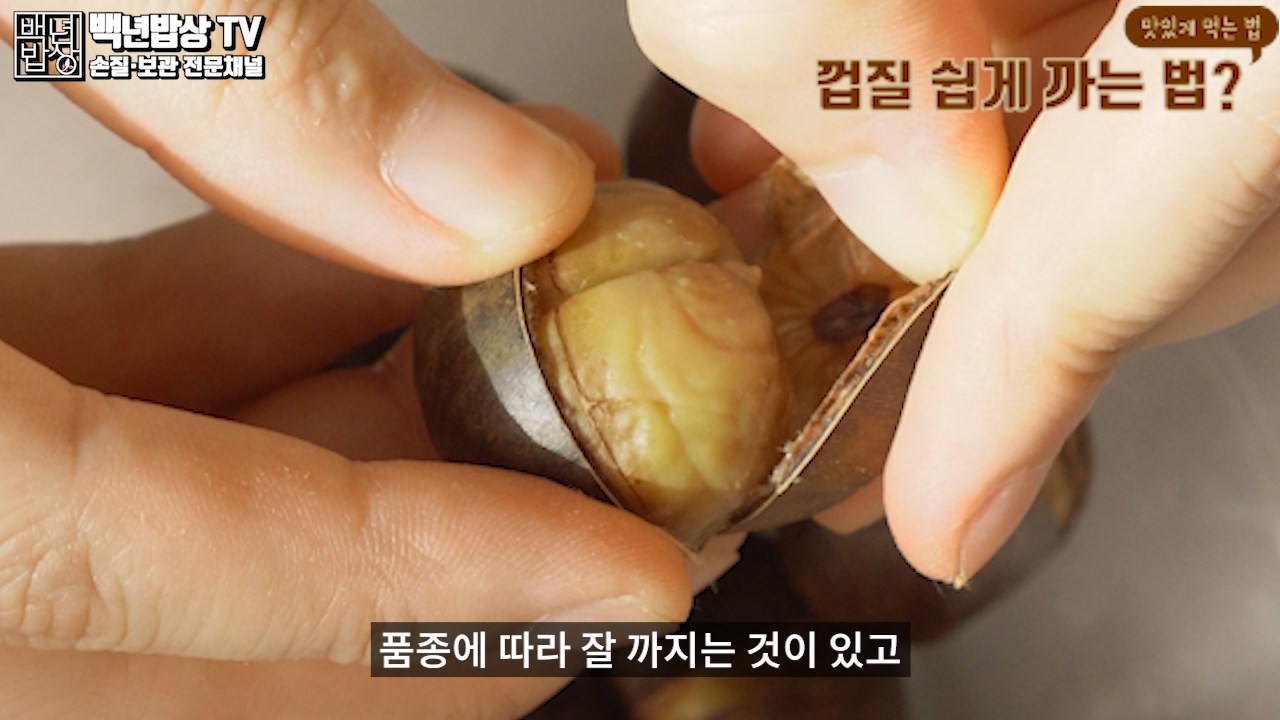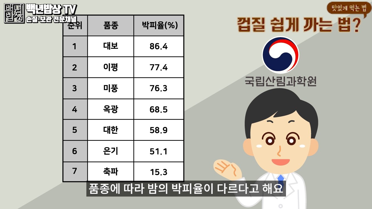 국립산림과학원 연구에 따르면 품종에 따라 밤의 박피율이 다르다고 해요. 품종에 따라 잘 까지는 것이 있고, 전처리를 아무리 해도 까지지 않는 것이 있어요.
