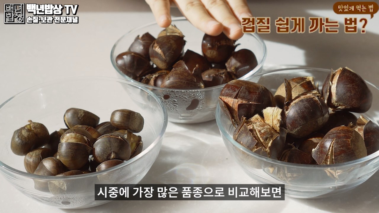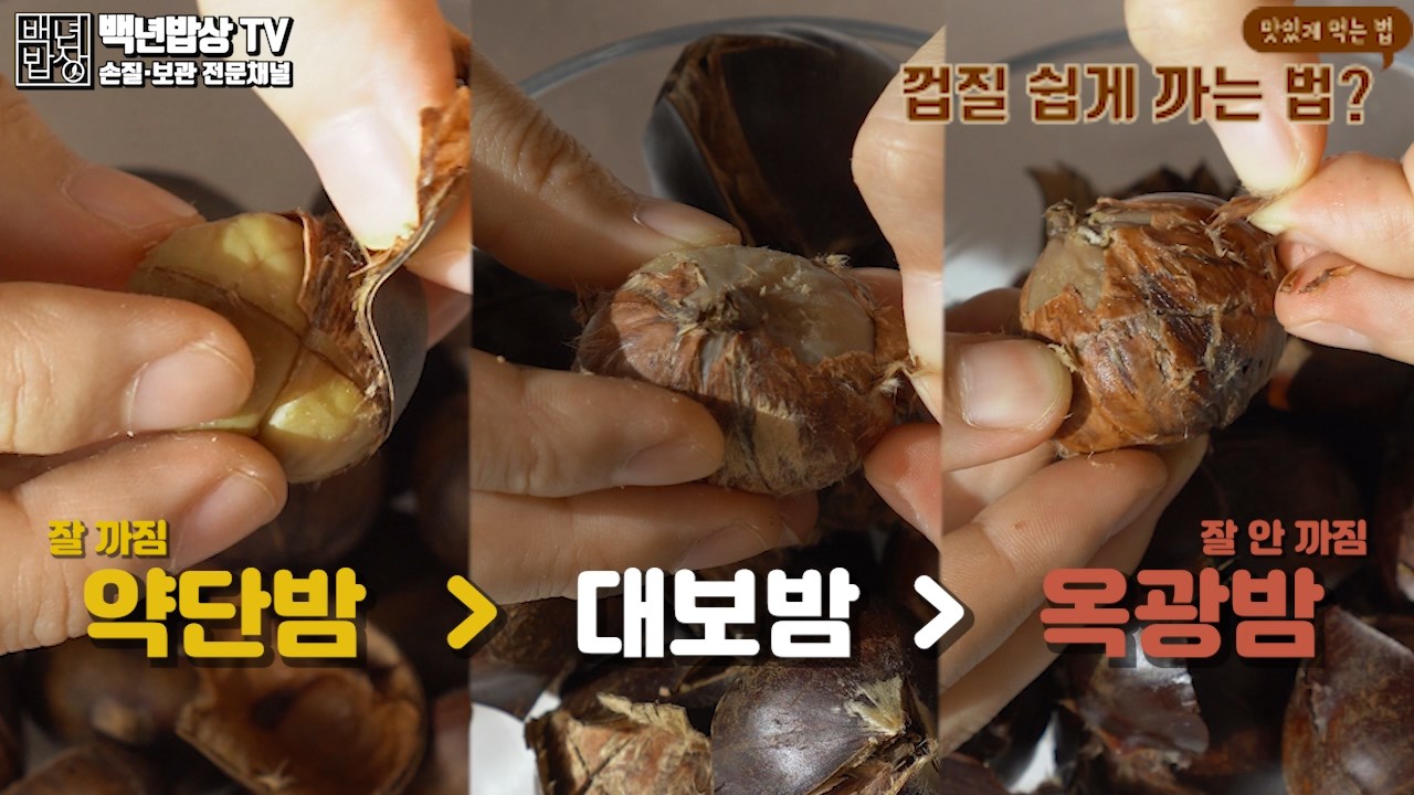 시중에 가장 많은 품종으로 비교해보면 약단밤, 대보밤, 옥광밤순으로 잘 벗겨집니다. 옥광밤은 외피는 잘 벗겨지지만 내피는 잘 벗겨지지 않아요. 취향에 따라 원하시는 품종을 구매 하세요!