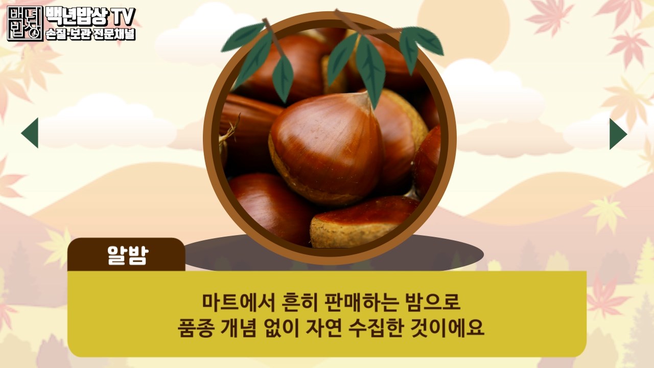1. 알밤 : 마트에서 흔히 판매하는 밤으로 품종 개념 없이 자연 수집한 것이에요.