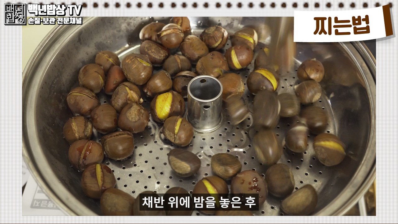 냄비에 물을 자작하게 붓고 채반 위에 밤을 놓은 후 센 불에서 20분간 삶아줍니다. 5분간 뜸을 들인 후 찬물로 헹궈 드세요. (전자레인지에 30초 정도 더 돌려주시면 껍질이 잘 벗겨져요)